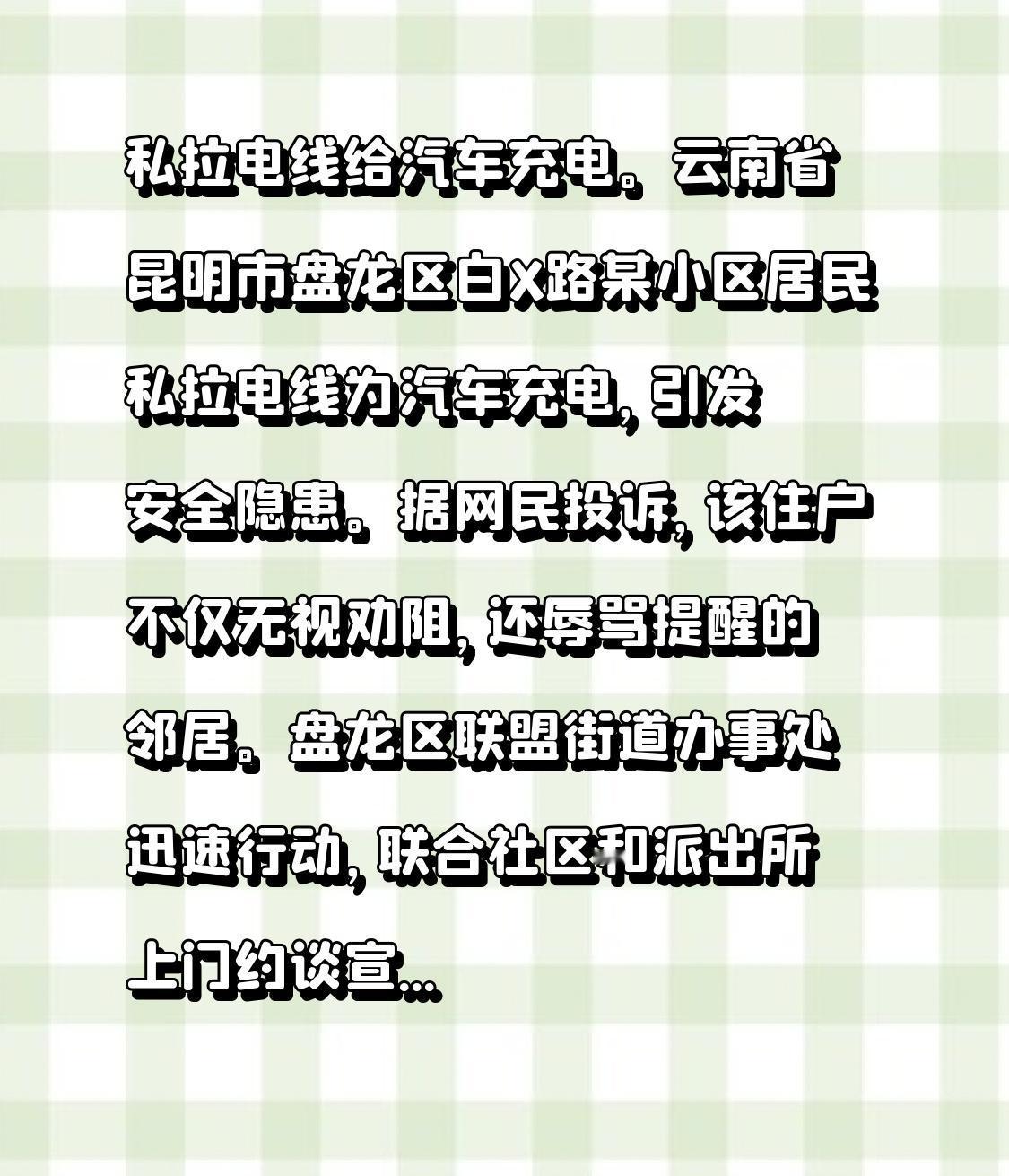 私拉电线给汽车充电。 云南省昆明市盘龙区白X路某小区居民私拉电线为汽车充电,引发安全隐患。据网民投诉,该住户不仅无视劝阻,还辱骂提醒的邻居。盘龙区联盟街道办事处迅速行动,联合社区和派出所上门约谈宣讲消防法并批评其不当行为。同时物业被责令开展专项排查,增设充电设施和警示标志。 下一步街道将定期回访,联动消防、公安部门严防问题反弹,并在老旧小区推广安全充电整治,确保居民安全。