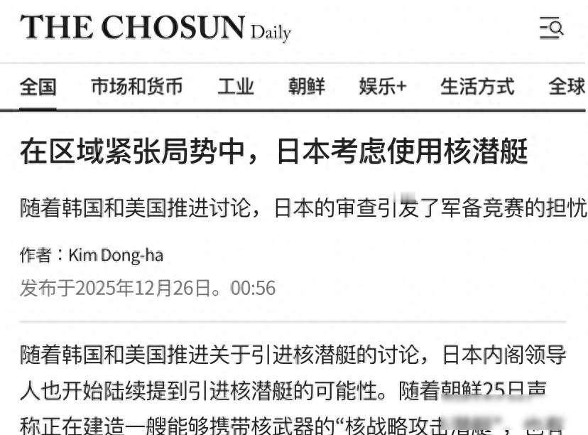 日本欲购核潜艇,防卫相放话打破禁忌,无核承诺还能守多久? 最近几天,日本政坛又出了件大事,12月25日,防卫大臣高市早苗在接受采访的时候说,我们不会排除任何选项,会考虑增强威慑能力,这话听起来平常,但细想一下,她其实是在明着说要搞核潜艇,核潜艇不是普通军舰,这事儿直接踩到了日本半个世纪都不敢碰的红线。 高市早苗不是随便说说,她上任后第一次提到核潜艇,之前防卫大臣小泉进次郎也说过类似的话,这说明日本政府真打算碰核潜艇这条线,有人问为啥突然要搞这个,原因很简单,常规潜艇靠电池,跑不远,待不了多久,要是换成核动力,就能从日本家门口一直走到印度洋,还能长时间躲在水下,等机会发动突袭。 有意思的是,日本这次的动作,跟周边国家的关系密不可分,韩国最近正跟美国商量造核潜艇的事,朝鲜那边据说也在琢磨这个,日本一看,再不动手就真赶不上了,高市早苗这话,表面上说别的,实际就是冲着中国来的,想用核潜艇压住中国在东海和南海的动静。 不过日本想搞核潜艇也不是没顾虑,1967年他们就定了条规矩,不造、不存、不引进核武器,这么多年没人敢动,现在高市早苗一提核潜艇,其实跟核武器没直接关系,可老百姓一听核字就心里打鼓,自民党里头有人急了,反对党也跟着闹,生怕这一步迈出去,就是给拥核开了口子。 美国这边倒是挺支持的,特朗普以前就答应过韩国搞核潜艇,现在日本也想学,美国正求之不得,无非是想把东亚的安全事务交给日韩,自己好抽身去忙别的,可日本老百姓对核辐射心里有疙瘩,真要搞核潜艇,得先花力气跟大伙儿讲明白,慢慢把心思捋顺了才行。 中国国防部第二天就出声了,说日本要是敢挑事,肯定要吃亏,这事还没完呢,日本到底是真想买核潜艇,还是只是吓唬人,无核三原则到底还能不能撑得住,看来东亚这片海,要不太平了。