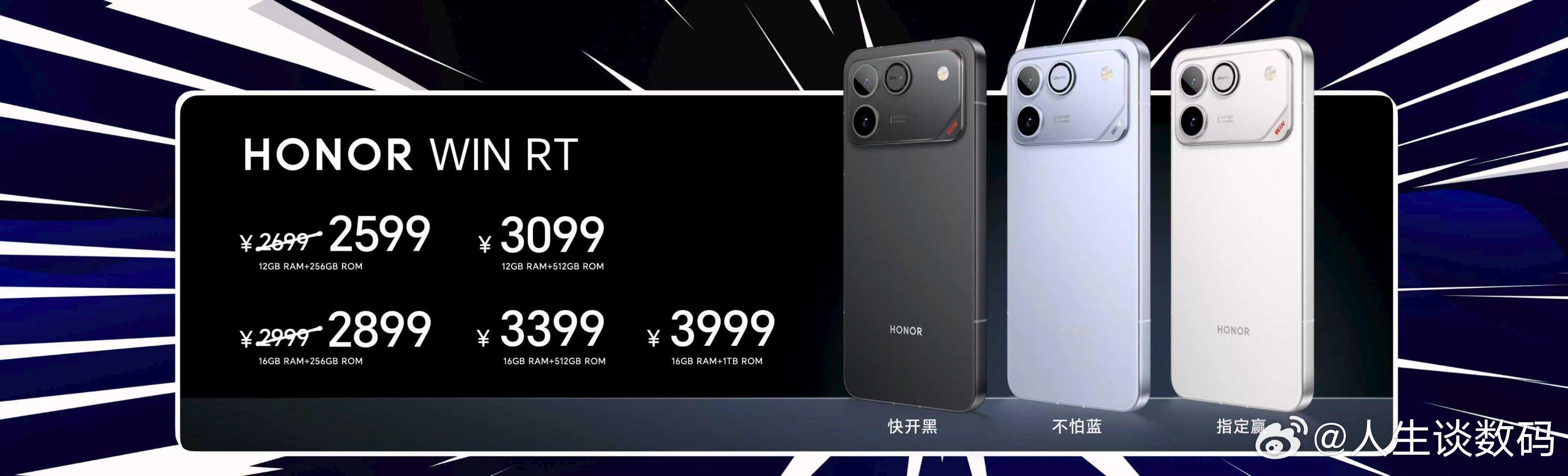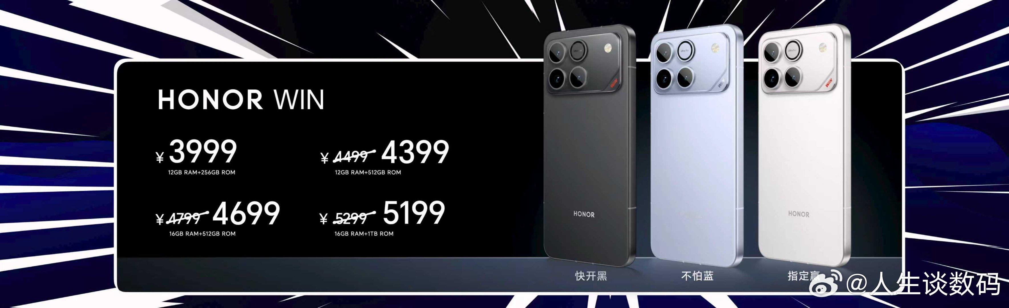 荣耀WIN系列共带来快开黑、不怕蓝、指定赢3款配色,现已全面开售,首销期间,共有总价值超过3829元的权益。上电商平台搜“荣耀WIN” 赢升杯赢免单,性能夯到顶,礼品赢麻了!荣耀WIN RT 12GB+256GB、16GB+256GB、12GB+512GB、16GB+512GB、16GB+1TB版本售价分别为2699元、2999元、3099元、3399元和3999元;荣耀WIN 12GB+256GB、12GB+512GB和16GB+512GB、16GB+1TB版本售价分别为3999元、4499元、4799元和5299元。 荣耀WIN荣耀WIN价格年度夯机荣耀WIN价格真香