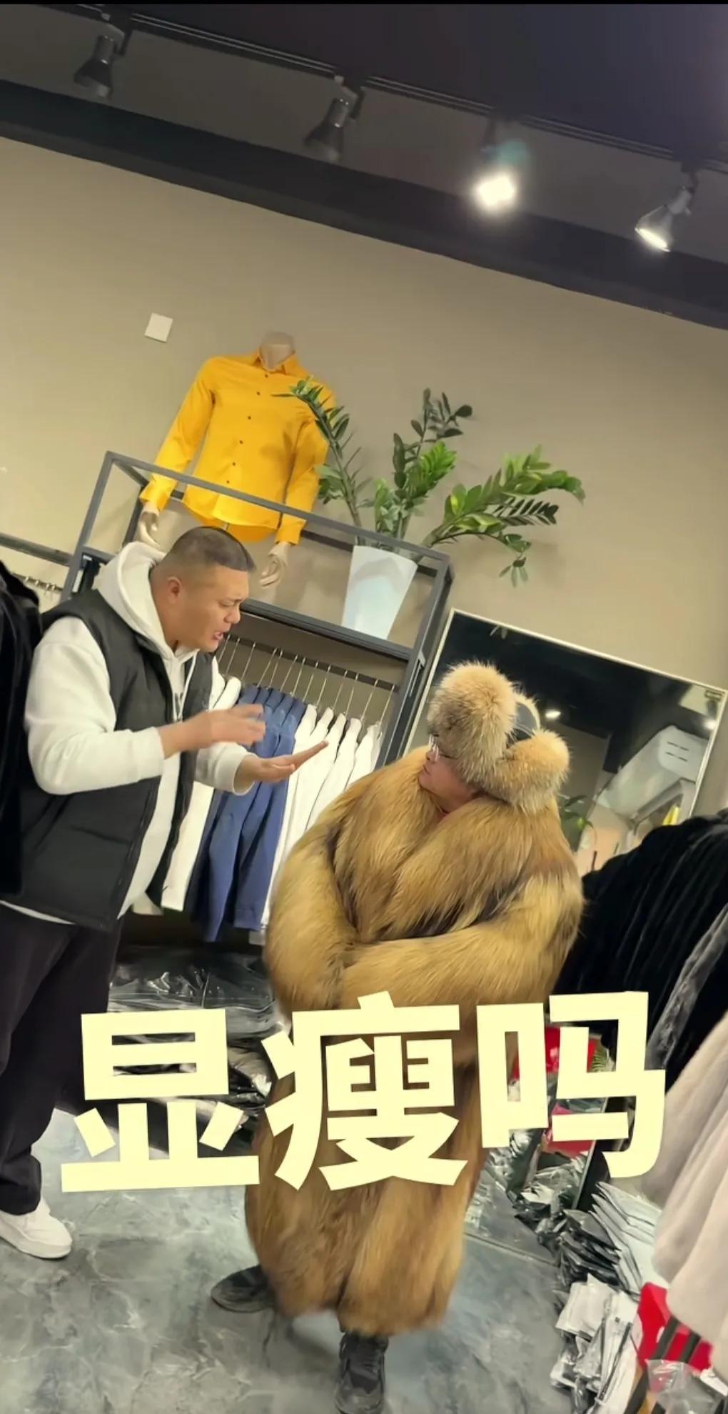 一男子逛男装店,看上了貂皮大衣,试穿后,店老板使劲的夸,不但穿着帅气暖和,而且还显瘦,男子在一声声的夸赞中迷失了自我,毫不犹豫的买下了大衣。