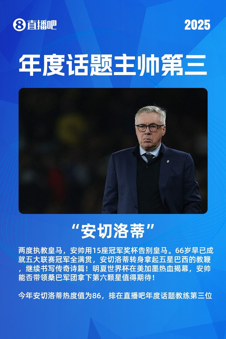 今年安切洛蒂热度值为86,排在直播吧年度话题教练第三位。