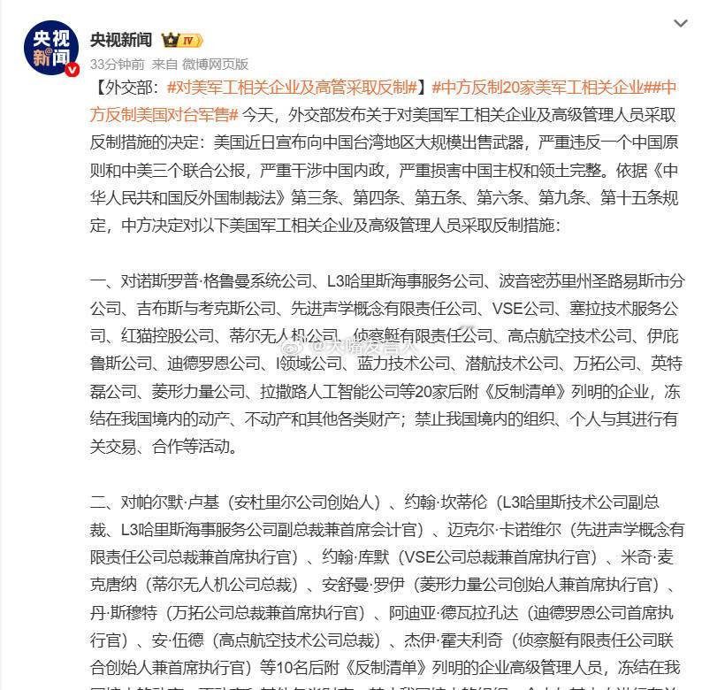 中方反制20家美军工相关企业 反制是应该的,但客观来说,实质作用不会太大跟湾湾作生意的美国军工企业,应该本来就跟大陆贸易往来不多如果想表达我们的愤怒,还有更多的行动可以采取,比如,比如他们向湾湾交付武器到岸时,我们敢不敢直接给湾湾炸了或者,还是觉得,即便不炸,对将来武统,这些蛙军手里的武器,也完全不是障碍对美军工相关企业及高管采取反制,中方反制美国对台军售 ,热点观点