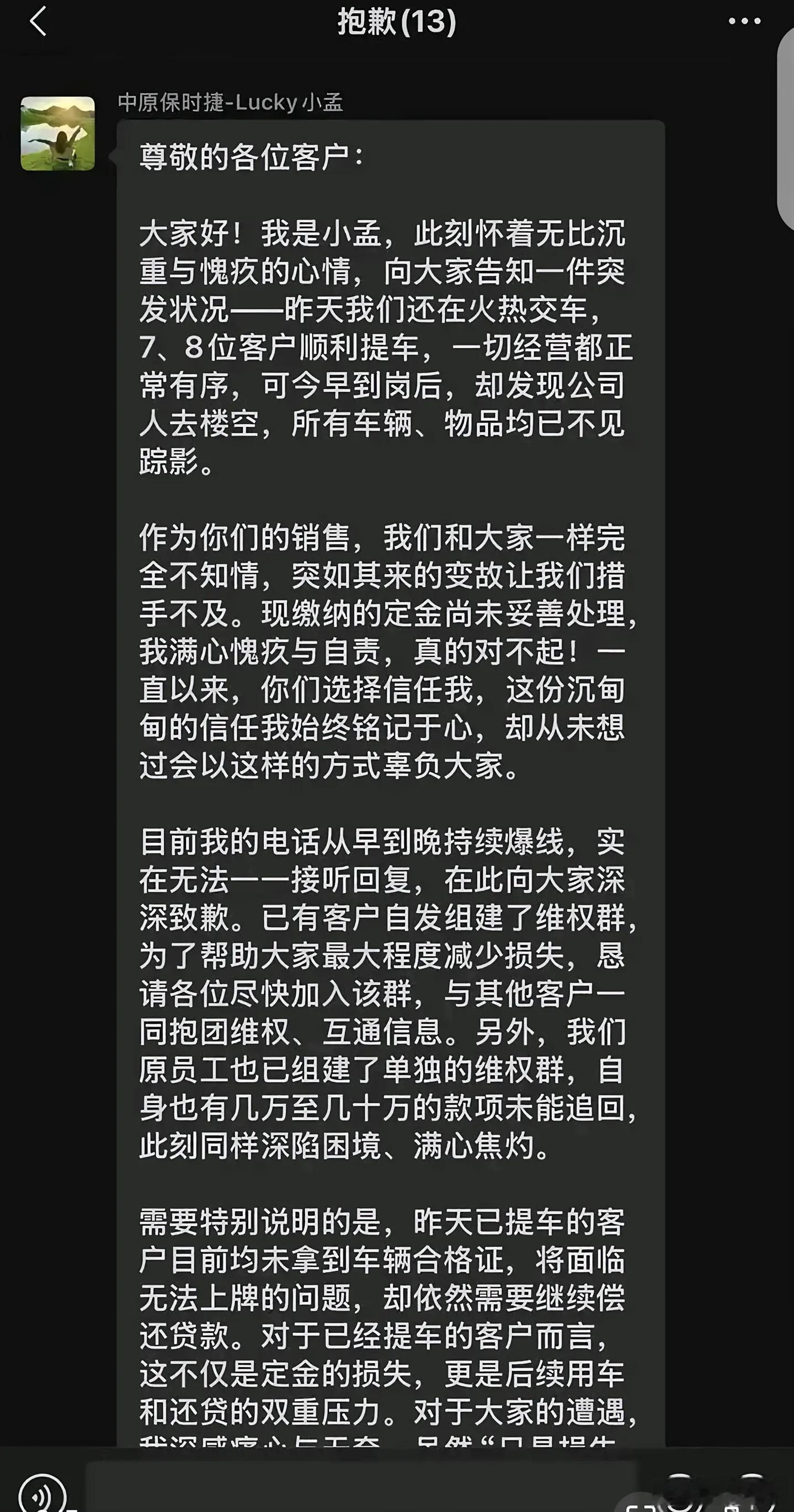 前两天河南最大的保时捷授权店不是连夜“跑路”了吗?现在和郑州中原保时捷中心同属一家的宝马4S店也出现了经营异常的情况,都是河南东安控股旗下的,东安控股旗下还有40余家子公司,除了保时捷、宝马外,还有奥迪等多个豪华品牌,是中原地区规模较大的汽车综合服务商。看样子像是资金链断了,是经销商自身经营的问题,跑路前一周换了法人,肯定是早有预谋,保时捷中国还出来道歉了,说正在联合相关部门核查事实。这其实暴露出豪华车授权经销模式的风险,就是经销商资金链脆弱,一旦断裂就会让消费者买单,品牌方对经销商的监管与风险没有把控……保时捷回应中原保时捷中心经营异常保时捷回应郑州中原保时捷中心疑似跑路保时捷中国回应郑州一门店疑似跑路郑州一保时捷门店突然人去楼空