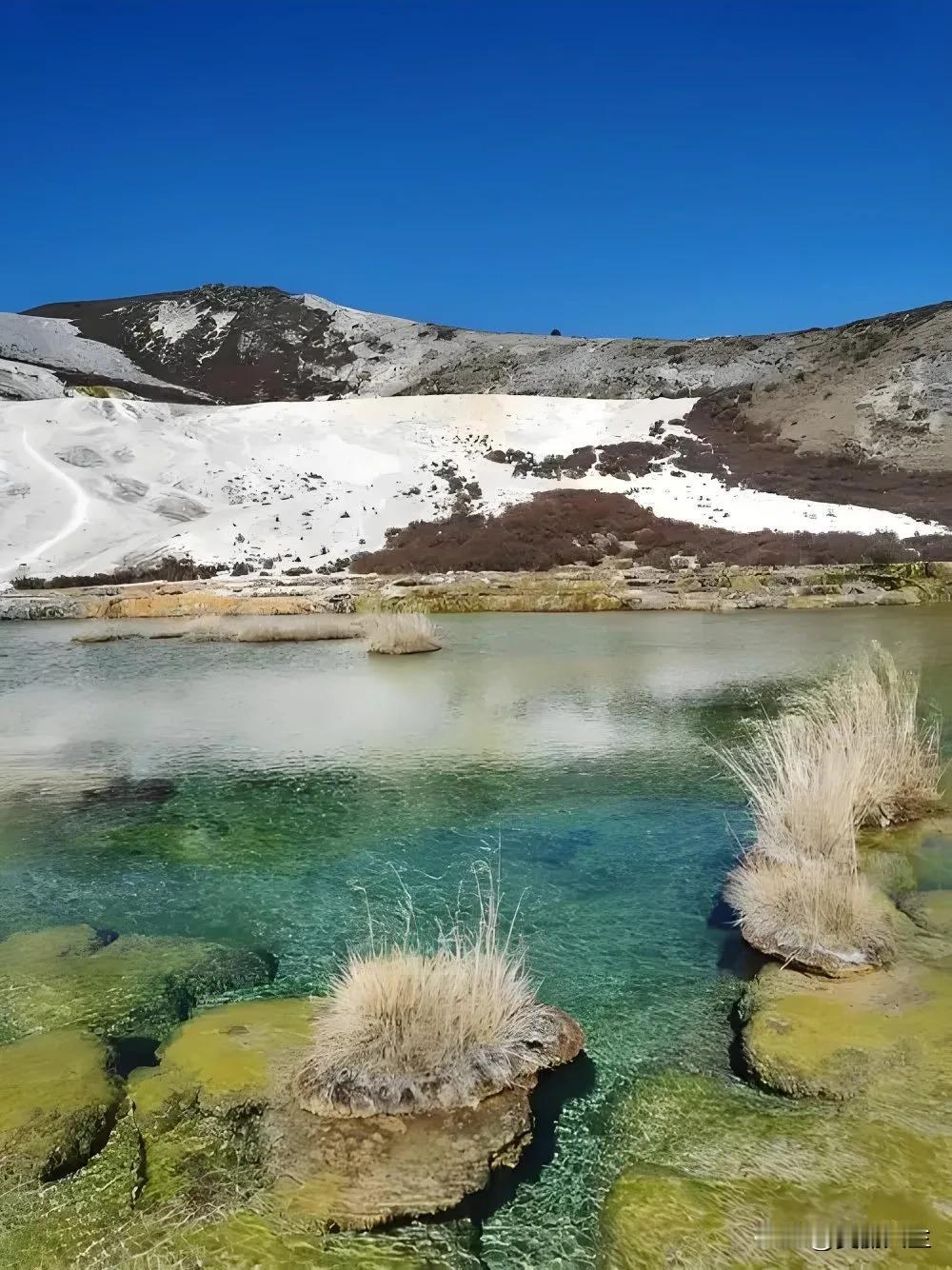 冷噶措在12月呈现出独特的蓝冰景观,湖面冻结成晶莹的蓝色冰块,冰层下隐约可见气泡