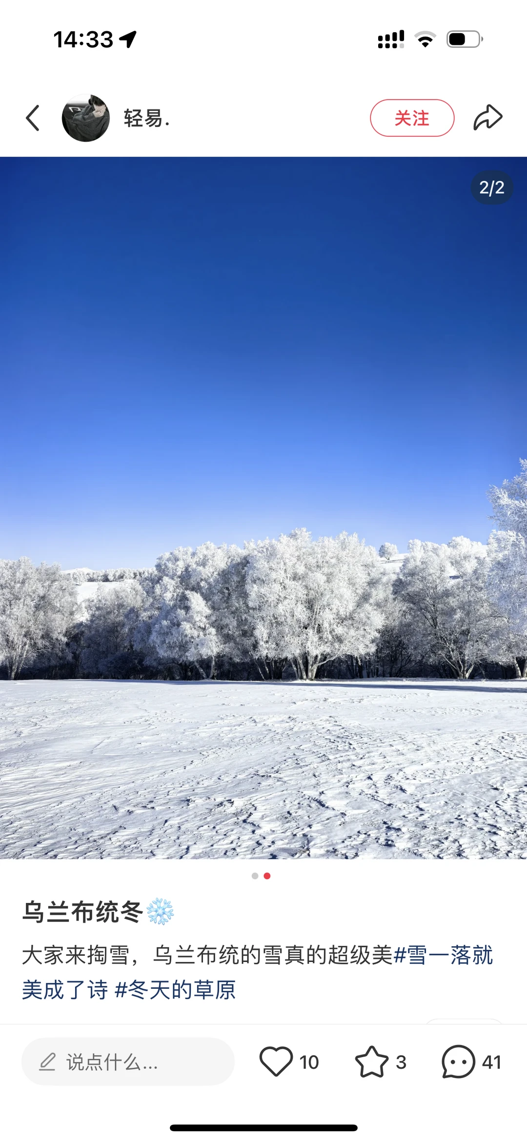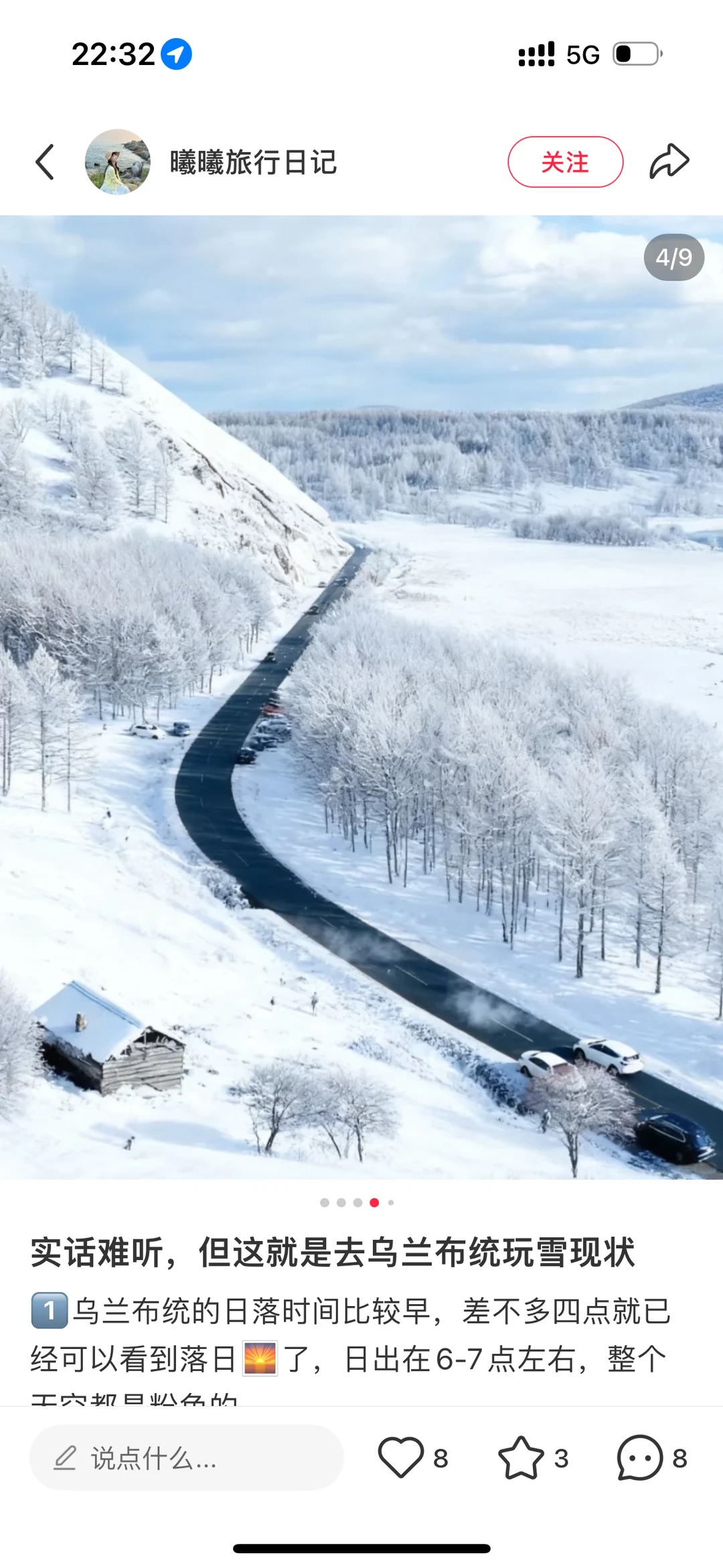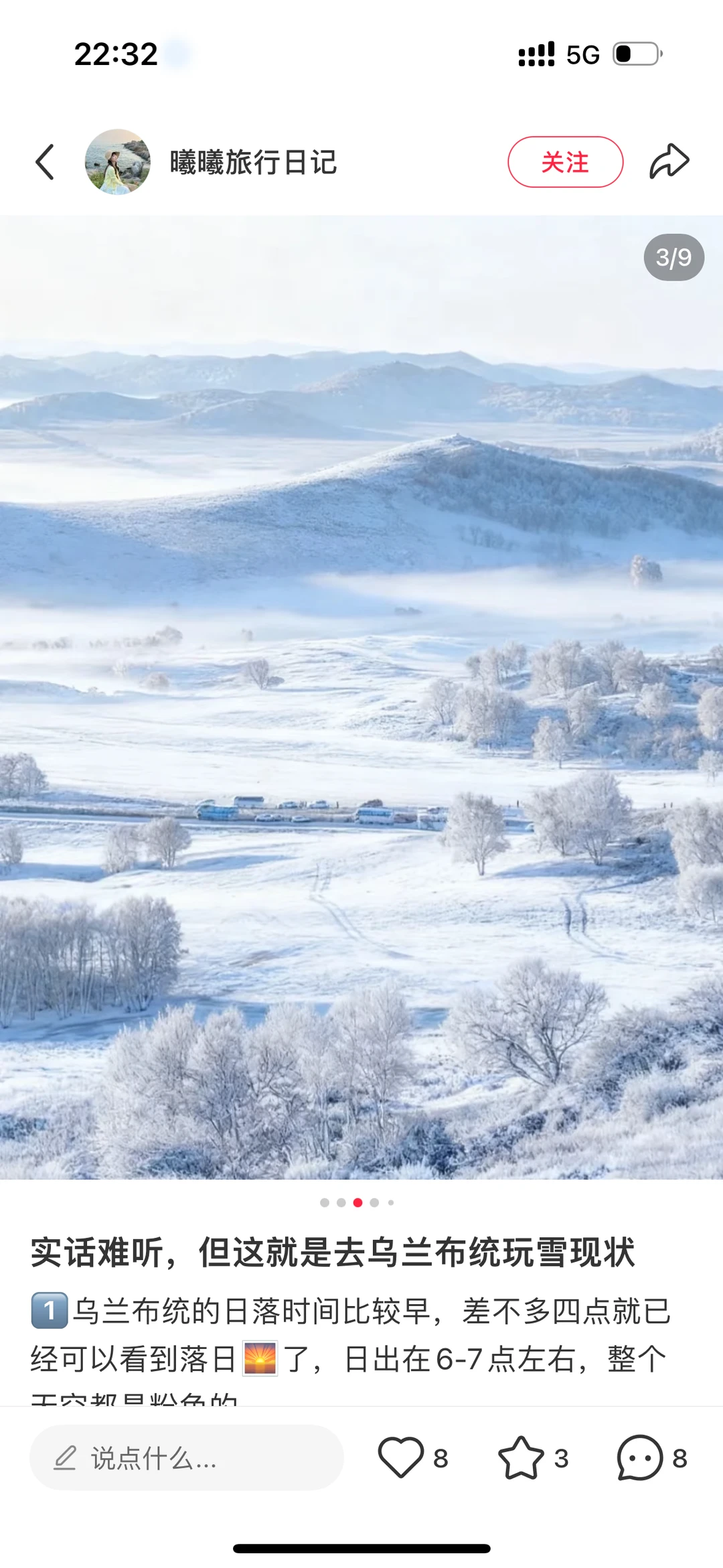 本来是定好要去乌兰布统的 和民宿老板都约好车了 带我们雪地穿越,一天600 但今天刷到,说乌兰布统现在雪不大 而且最近也不下雪 到脚踝都没有 想看图2-10的这种 听说黄岗粱的能到腰深,尊嘟夹嘟? 有这会在乌兰布统,黄岗粱的人吗? 元旦三天,北京出发来回 去哪儿比较推荐