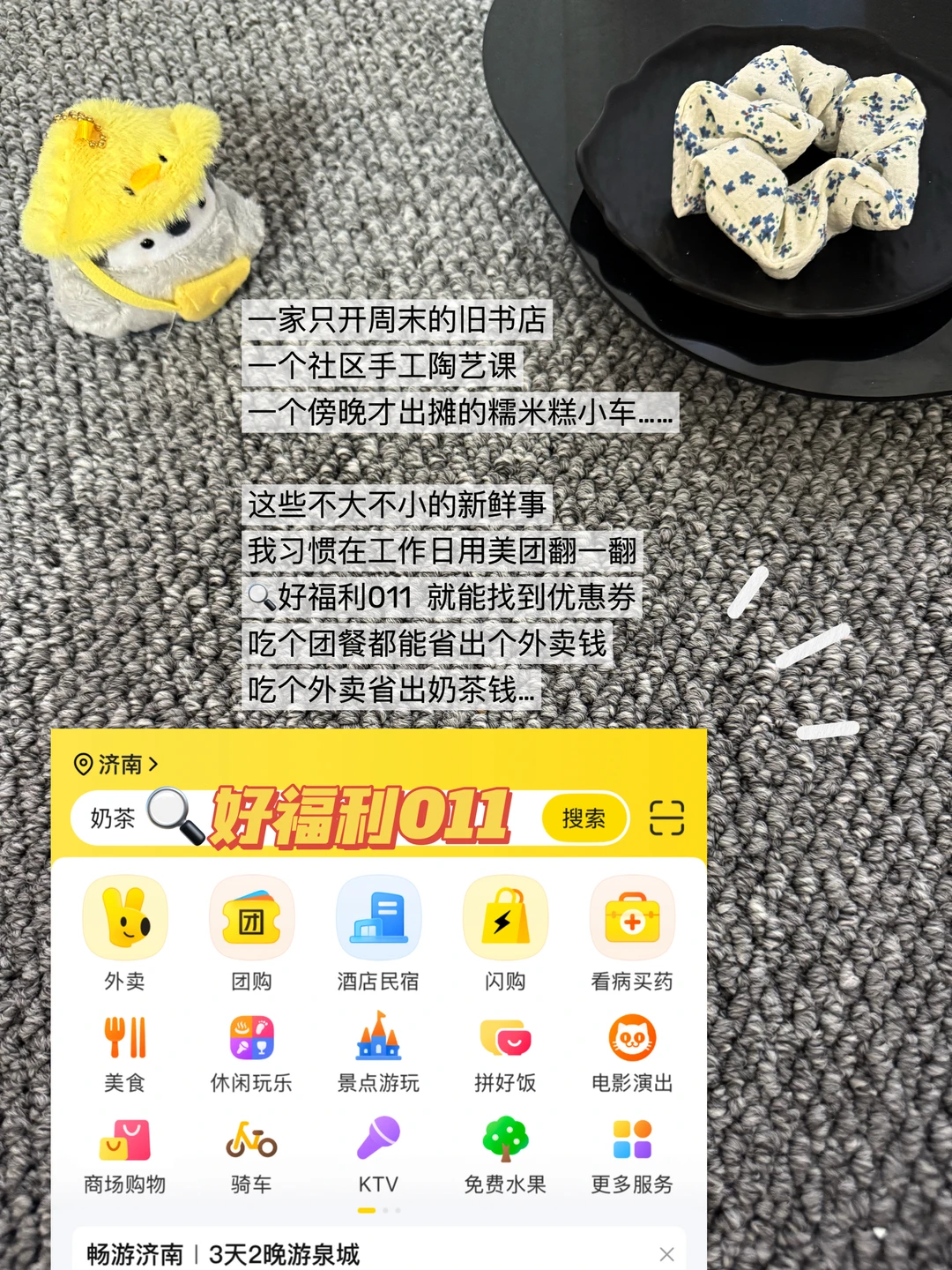 城市里藏了不少隐蔽角落:一家有故事的旧书店、一个手工陶艺体验课、一个傍晚才出摊的糯米糕小车……这些不大不小的新鲜事,我习惯用美团翻一翻,🔍好福利011能经常在活动页面找到这类实惠的优惠券,吃个团餐能省出个外卖钱,吃个外卖能省出奶茶钱,也给期待中的周末埋一颗彩蛋。