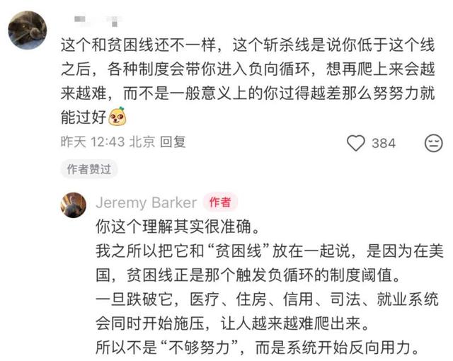 这些现象与此前部分人群对美国的认知形成了巨大反差,很多中国网友受到震撼,质疑其真实性。对此,也有美国网友现身说法,指出“斩杀线”不过是美国人熟知的“生存门槛”的一个新名字。
