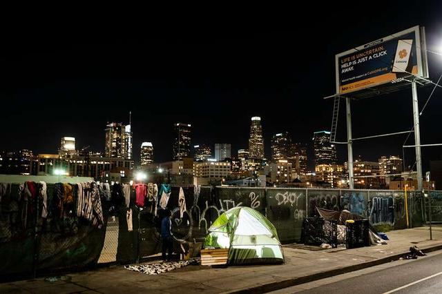 2023年2月8日,美国洛杉矶,闪亮的城市夜景中,无家可归者的帐篷。视觉中国供图