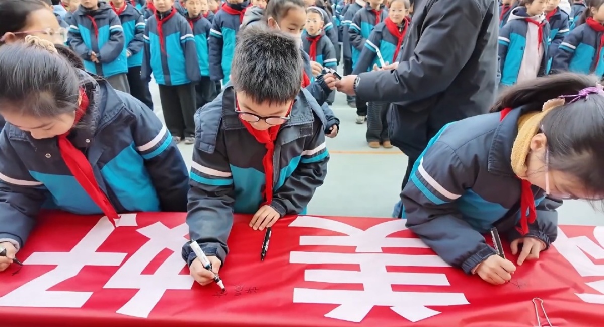 展出现场还设置了交流互动、集体宣誓、签名承诺等环节,全体同学跟随老师庄严宣誓:“我们是环保小卫士!守护绿色家园,我们责任在肩;践行低碳生活,从我做起!从今天做起!”随后,师生们纷纷在“守护绿色家园,共筑美好明天”的条幅上签字,用实际行动践行环保承诺。
