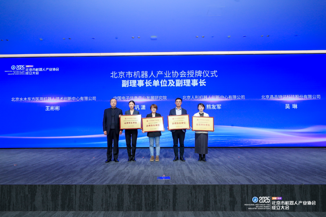 随后,大会依照协会章程,完成第一批副理事长单位授牌。中国电子信息产业发展研究院、北京人形机器人创新中心有限公司、北京水木东方医用机器人技术创新中心有限公司、北京晶品特装科技股份有限公司,被推选为协会副理事长单位,巩潇、熊友军、王彬彬、吴琳分别代表各单位出任副理事长。