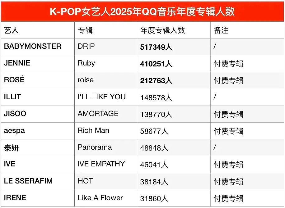 QQ音乐年度专辑人数男女艺人top3男艺人:权志龙 cortis Seventeen女艺人:babymonster Jennie 朴彩英