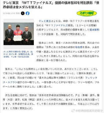 虎扑12月26日讯近日,东京电视台于26日在台内特别表彰了乒乓球选手张本智和。他在10日至14日举办的WTT香港总决赛——这场决定乒乓球WTT巡回赛年度总冠军的赛事中,夺得男子单打冠军,成为首位斩获该荣誉的日本选手。当日,张本智和到访东京电视台,鉴于其此次夺冠“提升了日本乒乓球在世界乒坛的存在感,也为转播本次赛事的BS东京电视台与东京电视台大幅提升了品牌形象”,东京电视台社长向其颁发了感谢信与奖金。