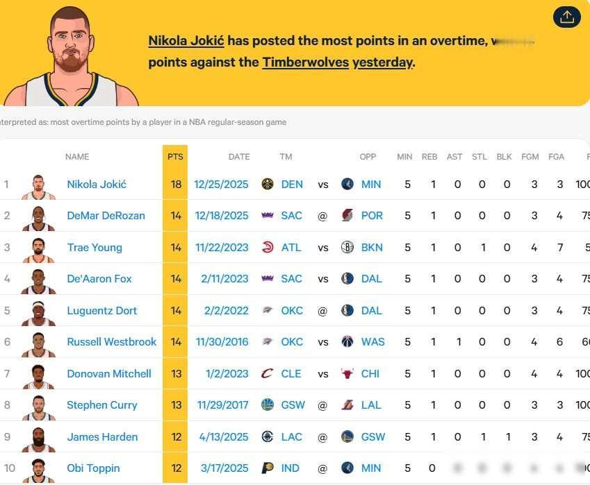 前无古人,约基奇加时3中3&11罚10中得18分,创NBA加时得分新高 今天NBA圣诞大战,丹佛掘金对明尼苏达森林狼,打得特别胶着,最后五分钟双方七次交替领先,终场前2.8秒还打成平手,最后掘金靠加时赛142比138赢了,森林狼第三节最多落后16分,第四节突然打出一波11比2,硬是把比赛拖进加时,约基奇在最后关头站出来,扛着球队拿下了胜利。 加时赛一开,森林狼突然连着扔进三个三分,两分钟里打出一波9比0,反超了比分,约基奇这时候站出来,外线两记超远三分稳住节奏,接着突破上篮被犯规,罚球进了一个,最后两分钟他站在罚球线,十一次罚球进了十个,单节拿了十八分,对手想翻盘的念头就这么灭了,更衣室里所有人都看着他背影,一句话都说不出来。 赛后数据说,约基奇加时赛拿了19分,打破了NBA自1951年有记录以来的单节得分纪录,以前常规赛最高是14分,他直接多出了整整五分,记者问他是不是早知道要破纪录,他笑了笑,摊开手说,我只想着球队得赢,那些数字嘛,等比赛完了再看,这时候更衣室的电子屏正亮着JOKIC 53 PTS,比他举手庆祝的样子还亮。