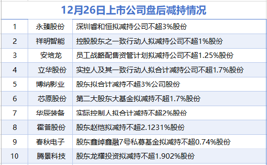 据统计,12月26日,盘后徐工机械披露增持情况。永臻股份、祥明智能、安培龙、立华股份、博纳影业、芯原股份、华辰装备、霍普股份、春秋电子、腾景科技等10家上市公司披露拟减持情况。