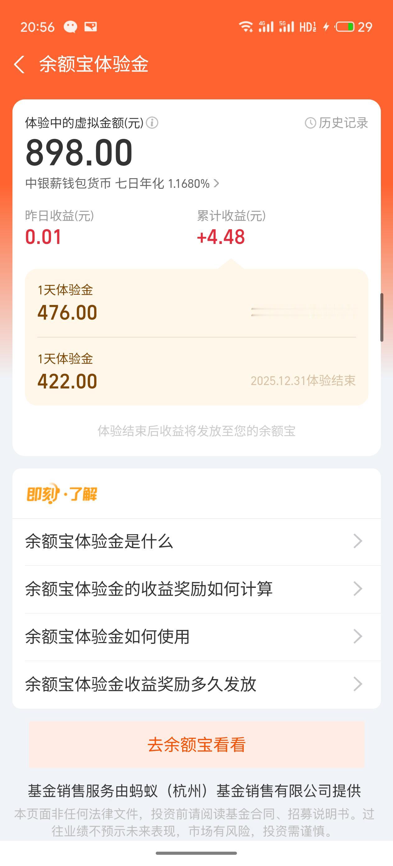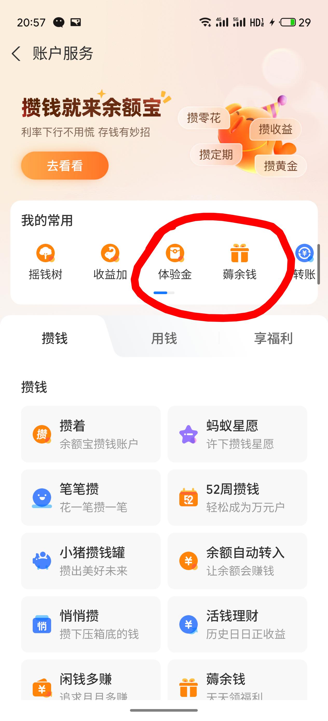 余额宝 账户服务 后面 点 更多 体验金和薅余钱 每天都可以把任务点一点 花个几分钟 能🉐到体验金 蚊子🦟腿上的肉 不多,不过好在不怎么花时间