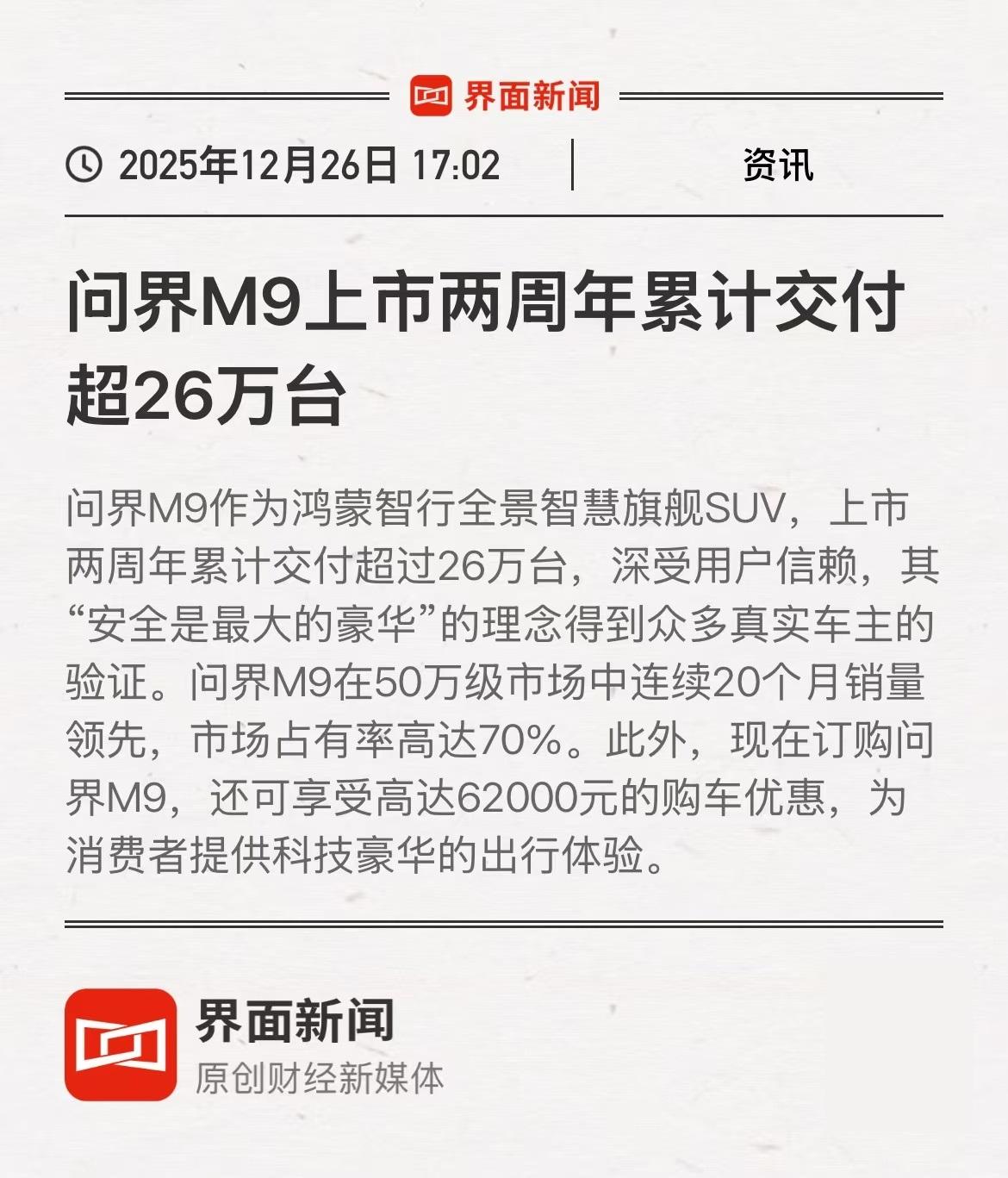 保值率双冠背后 问界M9两周年诠释豪华车长期价值 在车市价格战愈演愈烈、保值率波动加剧的当下,问界M9上市两周年交出的双权威保值率冠军答卷,恰恰诠释了豪华车应有的长期价值。它不仅连续四个月蝉联流通协会插混(含增程)保值率榜首,更斩获巴芒达奖国产增程混动SUV保值率第一,成为穿越行业周期的“硬通货”。这份底气绝非偶然,而是建立在全维产品实力之上。华为乾崑智驾的持续OTA升级让车辆“常用常新”,途灵智能底盘保障长期性能稳定,玄武车身与全场景安全配置降低贬值风险。26万台累计交付的市场基础,叠加连续两期新能源NPS榜首的用户口碑,形成“产品力-市场认可-高保值”的正向循环,让问界M9真正实现“买得值、用得久、保得住”。