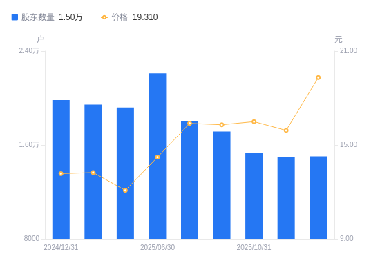 日期A股户数(户)流通A股户均持股数(股)户均持股市值(万元)2025-10-311535810730.0617.692025-09-30171489610.0015.652025-08-10180379136.0014.962025-06-30221017456.0410.602025-03-31191858578.6610.382025-03-01194468463.3911.212024-12-31198208303.6910.942024-09-30192148493.6310.672024-06-30404714032.435.622024-03-31170969545.0514.51
