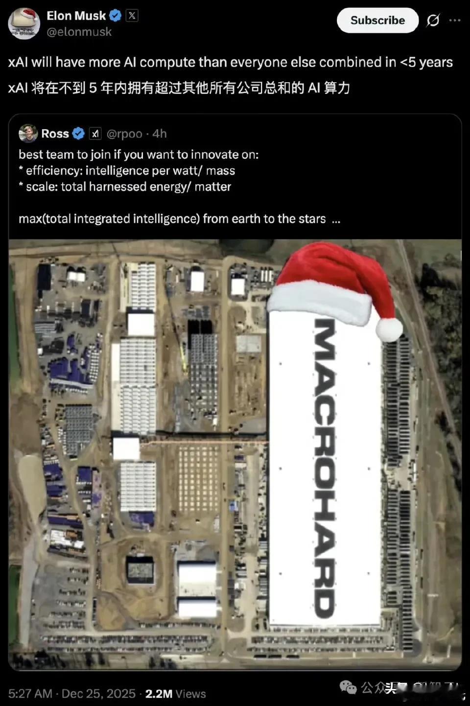 马斯克又放卫星了,这次瞄准了AI算力! 5年内,xAI的AI算力将超过所有其他公司的总和。。。 这绝对是一个超级大卫星啊,直接蔑视一切对手,包括OpenAI、google、Meta等等所有头部选手。 这种事马斯克之前干过很多,这次能成功吗? 也许吧,至少目前能看到的是,今年3月初,xAI买了一块地皮,不到半年就完成了基础设施建设,而OpenAI等对手需要用15个月才能完成同样的事。