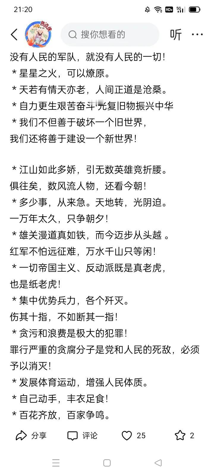 从毛主席诗词学习毛泽东思想 *红军不怕远征难,万水千山只等闲。 雄关漫道真如铁,而今迈步从头越。 中国共产党和人民军队要救国救民、推翻三座大山,就得有开天辟地、英勇无畏的奋斗精神。同时要坚定信仰,乐观积极地战胜千难万险,要有必胜的信念! *金猴奋起千钧棒,玉宇澄清万里埃。 今日欢呼孙大圣,只缘妖雾又重来。 孙悟空不信邪、不怕鬼、疾恶如仇、追求真理,敢于斗争! 面对美帝、苏修等等敌对国家的欺压侵犯,中国政府和中国人民就是要学习孙大圣战天斗地、降妖除魔的英雄气魄,敢于亮剑、坚决斗争,打得一拳开、才能免得百拳来! *宜将剩勇追穷寇,不可沽名学霸王。 天若有情天亦老,人间正道是沧桑! 项羽优柔寡断、鼠目寸光,与刘邦签订了停战协议就放松警惕。结果被遭到围追堵截、八面埋伏,落得个自刎乌江的下场! 伤其十指,不如断其一指。 集中优势兵力,打歼灭战! 必须大量消灭敌人的有生力量,才能赢得正义与和平! *江山如此多娇,引无数英雄竞折腰。 俱往矣,数风流人物,还看今朝! 中国山河锦绣、地大物博,英雄辈出、建功立业!但是决定历史发展进步的决定性力量,并不是帝王将相,而是亿万劳动人民!人民就是英雄,英雄来自人民。 所以开天辟地以来,只有伟大领袖毛泽东高呼道‘’人民万岁‘’! 李世民说过‘水能载舟、亦能覆舟’。只有造福人民、顺应人民的正义要求,才能实现国家长治久安,建功立业! 反之,如果统治者像秦二世、隋炀帝那样横征暴敛、残民以逞,就是独夫民贼,必然导致政权覆灭、遗臭万年!