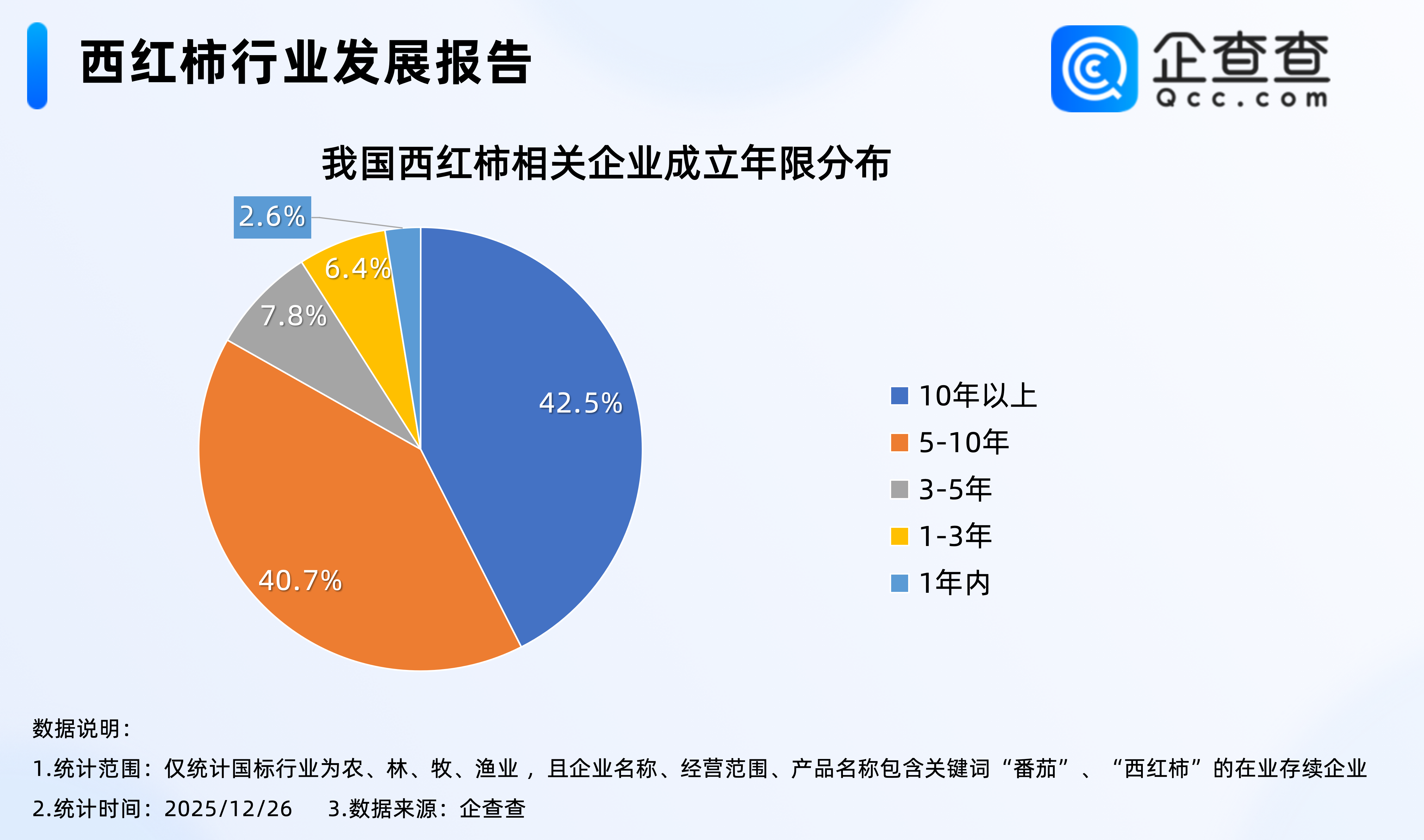 企查查数据显示,成立年限上,我国西红柿领域以老牌企业为主,超八成西红柿相关企业成立5年以上,其中成立超10年的企业最多,占比42.5%,成立5至10年之间的企业占比40.7%。