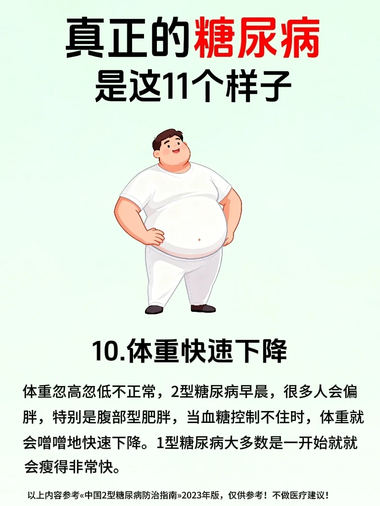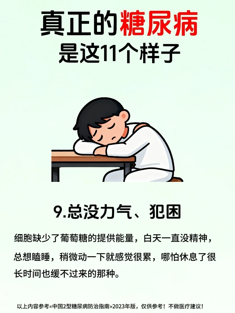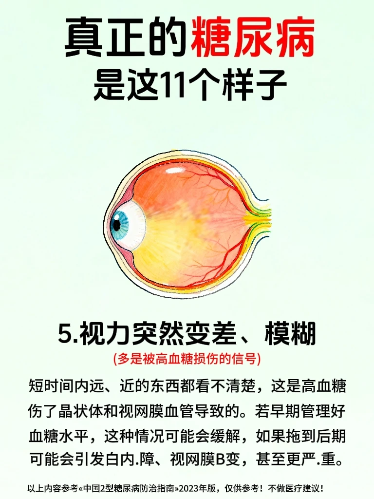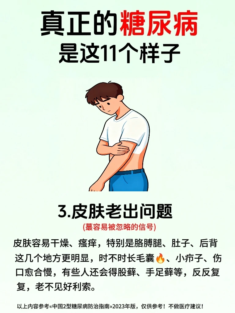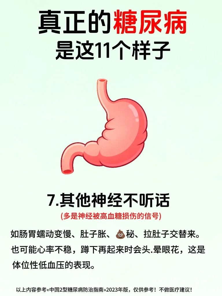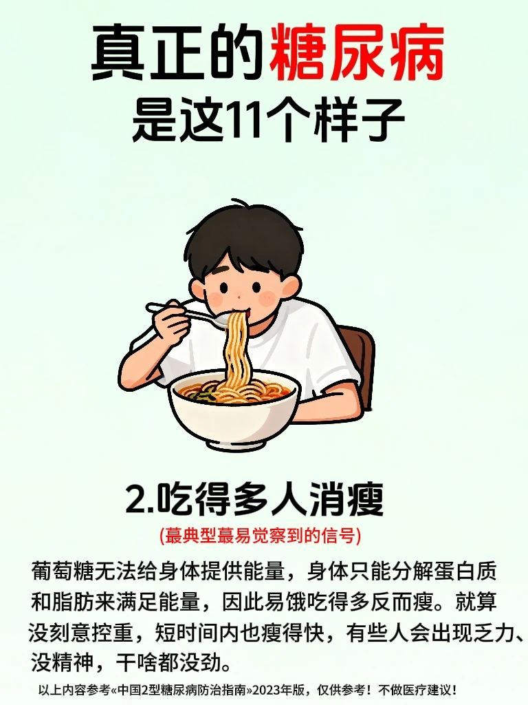 🙋糖友们一定要注意!千万不要以为糖尿病仅仅是因为血糖高,更重要的是要警惕身体发出的多种预⚠️警信号,大多数糖友会在早期忽略身体发出来的小信号,等察觉时却已经涉及到身体的多个系统了💔 . 🔍真正的糖尿病,核❤️问题就两个:①.胰岛素分泌不足,②.胰岛素抵抗。 👉血液里的葡萄糖无法被利用起来,血糖就一直飙升下不来,逐渐损.伤全.身的血管和神经💔,于是就影响代.谢、泌.尿、视力等,所以糖尿病并不是仅仅血糖高这么简单! . 🌟今天我参考«中国2型糖尿病防治指南»2023年版,整理了糖尿病会出现的身体发出来的11种信号,不管是糖友自己对照还是提醒身边朋友都超实用,早发现早重视早干预,稳定血糖更容易✊ . 🔥代.谢与泌.尿信号——蕞典型高频信号,一出现就要警惕⚠️ ①.多饮多尿 ②.吃得多反而瘦得快 ③.皮肤干燥.瘙.痒和其他症状,如图3 …………内容详见上面图文🖕 ⚠️糖尿病真的不是小事,不过得糖尿病后也不要过分焦虑,早发现早干预,按照糖尿病人一日三餐食谱吃,规律作息,发现有糖尿病早期症状时,严格遵医嘱控糖,也可以避免发.展成糖尿病并发症,将自己身体受损降到蕞低,千万不要把小信号拖成大问题💔,到时后悔莫及! . ❤️如果还有糖友得糖尿病后不知道怎么办时,前面笔记中有分享,也可以关🐖注我,我会经常分享有关糖尿病人的话题,大部分都是我自己实践过的哦!😯如: ✅糖尿病食谱 ✅糖尿病零食 ✅糖尿病诊断标准 ✅糖尿病可以吃的食物清单 ✅降血糖最快的方法 ✅糖尿病吃什么水果 ✅糖尿病一日三餐食谱大全 …………………… 二型糖尿病 糖尿病 糖尿病前期 糖尿病知识 控糖 健康饮食 控糖饮食法 身体发出的信号 健康知识 生活需要分享欲