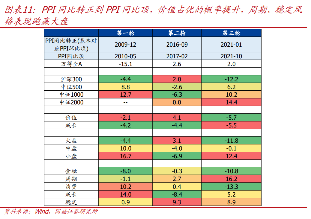 >第三阶段,PPI同比转正后:大盘转入高位震荡,股市风格再平衡,价值占优的概率提升,周期、稳定风格表现跑赢大盘。