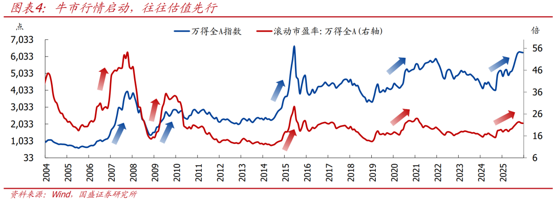 >PPI环比见底时,PPI同比转负还未触底,此时A股估值率先修复,全A指数开始上涨。如2008年12月、2014年6月、2020年4月和2024年9月分别是几轮A股上行行情的起点,但上述时点PPI同比降幅仍在继续扩大,PPI环比作为价格的“二阶导”,开始见底回升。此时指数走牛的核心逻辑在于政策和流动性环境改善的双重催化。