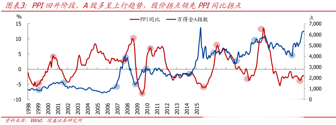PPI回升阶段,A股多呈上行趋势,股价拐点往往领先于PPI同比变动:在PPI同比还未触底时,估值率先修复,牛市行情启动;PPI回正后,A股才迎来盈利改善。