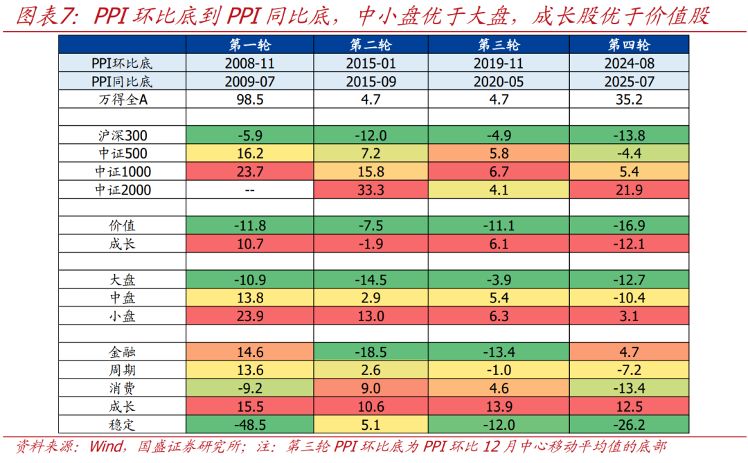 中小盘表现优于大盘,成长股表现优于价值股。我们计算PPI环比底到PPI同比底这一时间区间内,不同风格的宽基指数相较万得全A的超额收益。就市值规模而言,涨幅最高的是中证1000和中证2000,对应小微盘股,其次是中证500,对应中盘股,大盘股(以沪深300为例)持续跑输整体。就股市风格而言,受政策扶持和流动性宽松的催化,这一阶段成长股表现往往优于价值股,稳定风格表现最差。