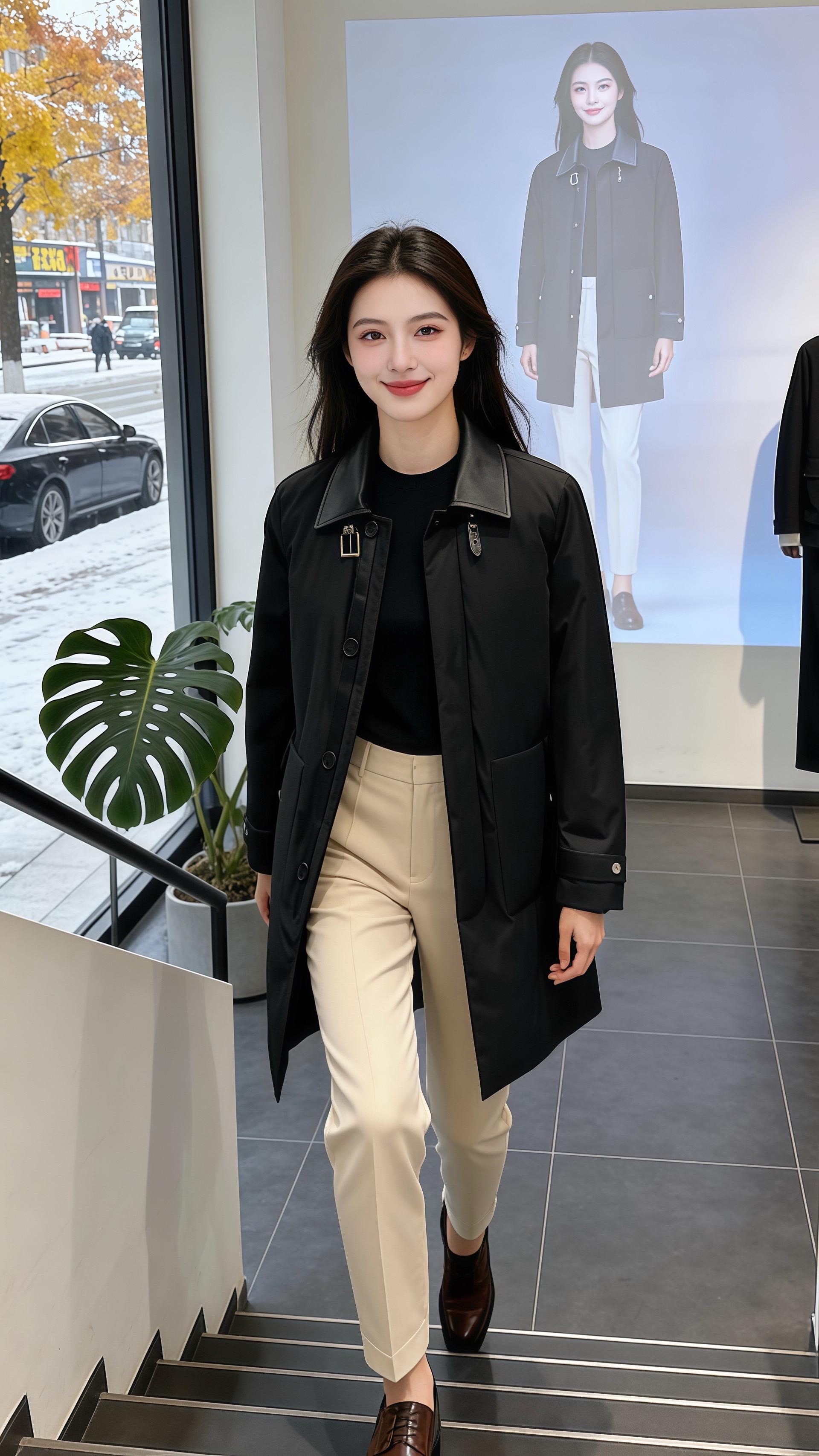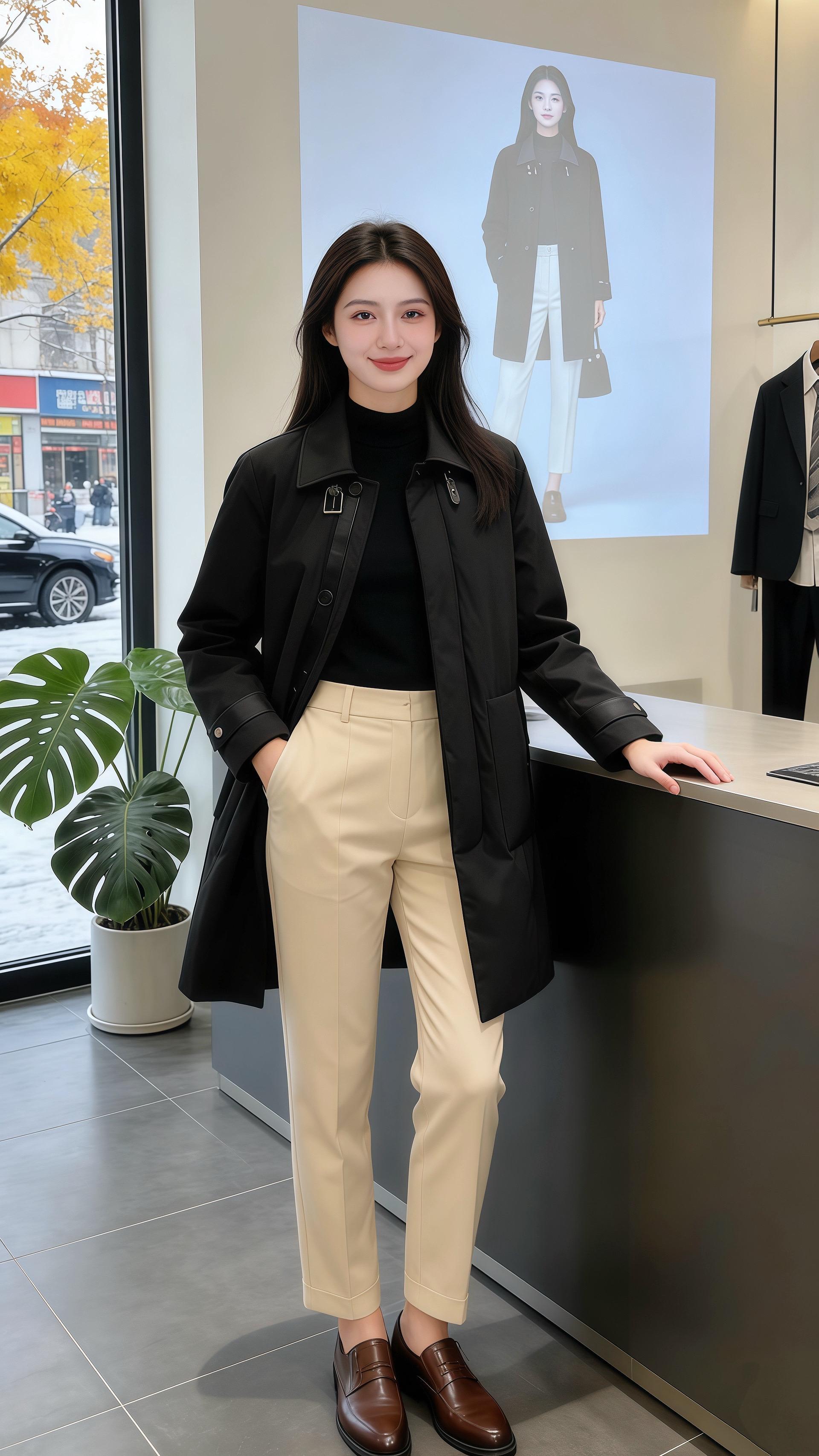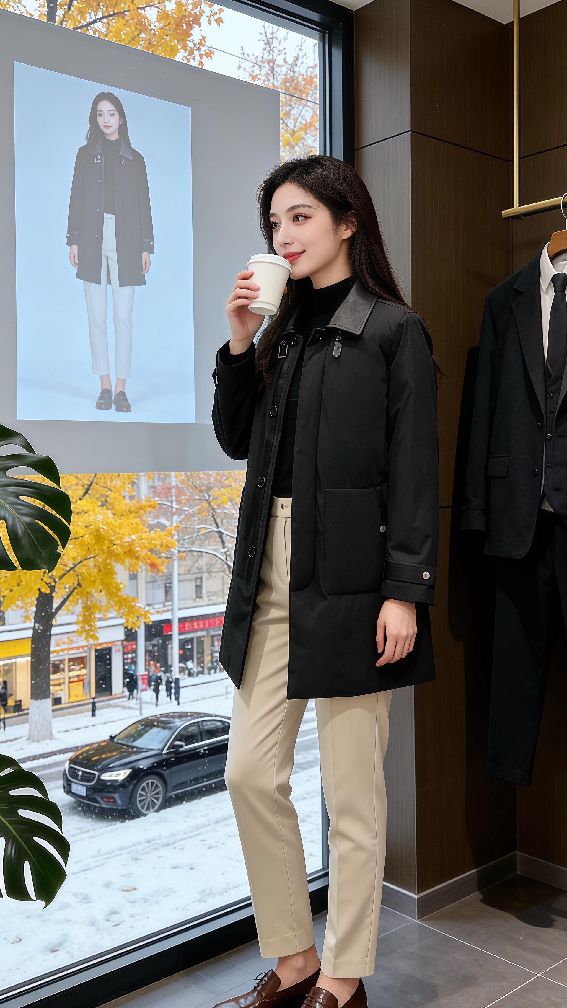 雪粒扑在服饰店的落地玻璃上时,皓明抬眼撞见许妍。她穿的黑色中长款外套翻领衬得肩线软而挺括,黑高领内搭收住脖颈线条,和米白长裤搭出一种冬日里的雅致,棕皮鞋的光泽落在裤脚,成了恰到好处的点缀,外套上的金属扣更添了几分精巧的细节感。
