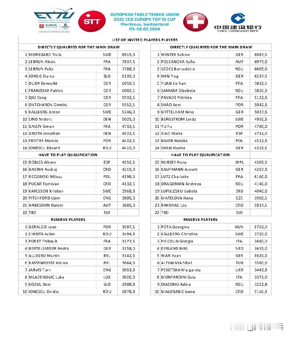 2026年国际乒联欧洲16强杯入围名单👀: 2月5日-8日 男单正赛:特鲁斯·莫雷加德、艾利克斯·勒布伦、费利克斯·勒布伦、达科·约奇克、贝内迪克特·杜达、帕特里克·弗朗西斯卡、邱党、迪米特里·奥恰洛夫、安东·卡尔伯格、安德斯·林德、西蒙·高茨、约纳坦·格罗特、弗雷塔斯、爱德华·约内斯库 女单正赛:沙宾·温特、索菲亚·波尔卡诺娃、伯纳黛特·斯佐科斯、韩莹、袁嘉楠、萨马拉、帕瓦德、邵杰妮、尼娜·米特兰姆、琳达·伯格斯特隆、付玉、肖瑶茜、巴约、单晓娜 男单资格赛:罗布勒斯、安德烈·加奇尼、卢卡·雷德齐姆思基、普卡、卡尔松、皮切福德、哈贝松、TBD 女单资格赛:赫尔希、考夫蔓、夏洛特·卢茨、德拉戈曼、卢普雷斯库、马特洛娃、拉科瓦茨、TBD