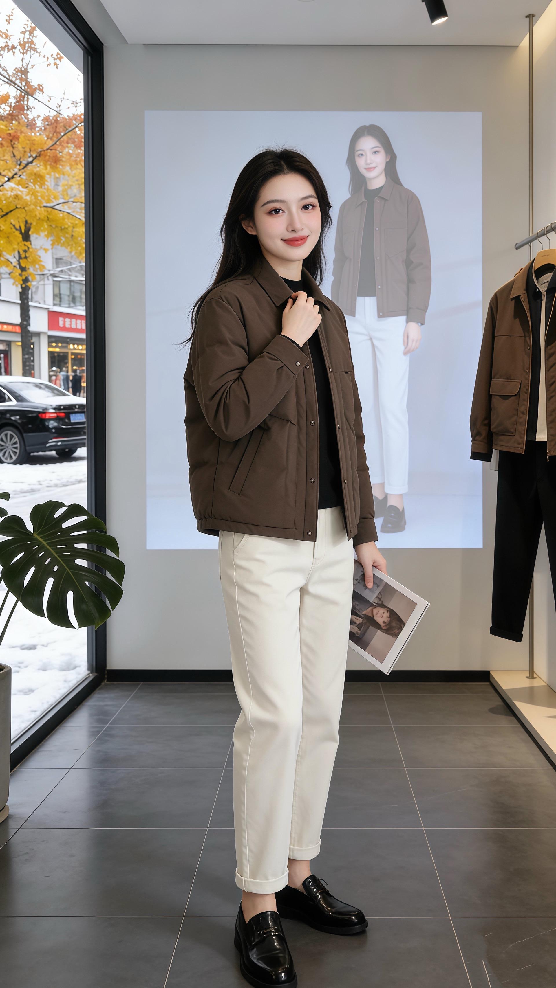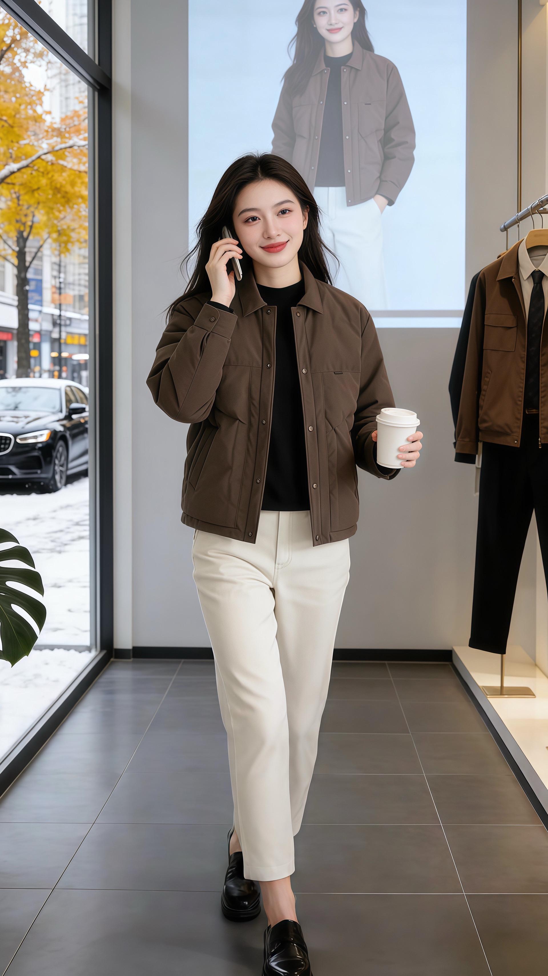 冬雪敲着男装店橱窗的午后,他推门进来,一眼撞进她咖色夹棉外套的质感里。面料带着哑光的细腻,翻领衬得内搭黑高领的脖颈线条利落,配着米白长裤与黑皮鞋,把冬的冷冽揉成了焦糖味的暖。