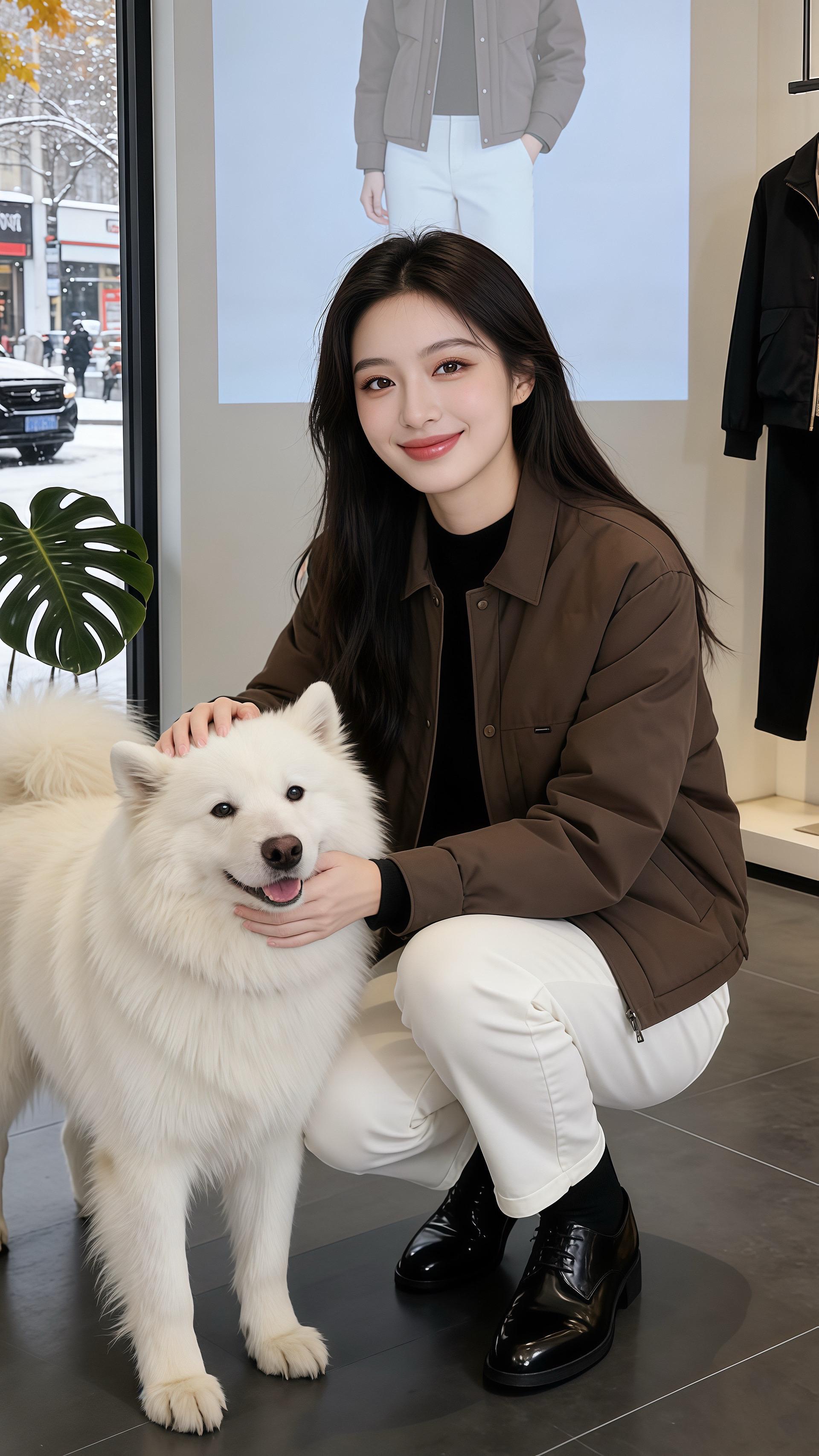 她蹲身揉萨摩耶的头,外套袖口的弧度贴在腕骨,比橱窗里的成衣更鲜活。他递过狗零食时说:“这咖色像刚烘好的咖啡豆,沉稳又衬得人温柔。”她笑,捻了捻领口黑边:“随手搭的,竟和店里的绿植刚好衬。”