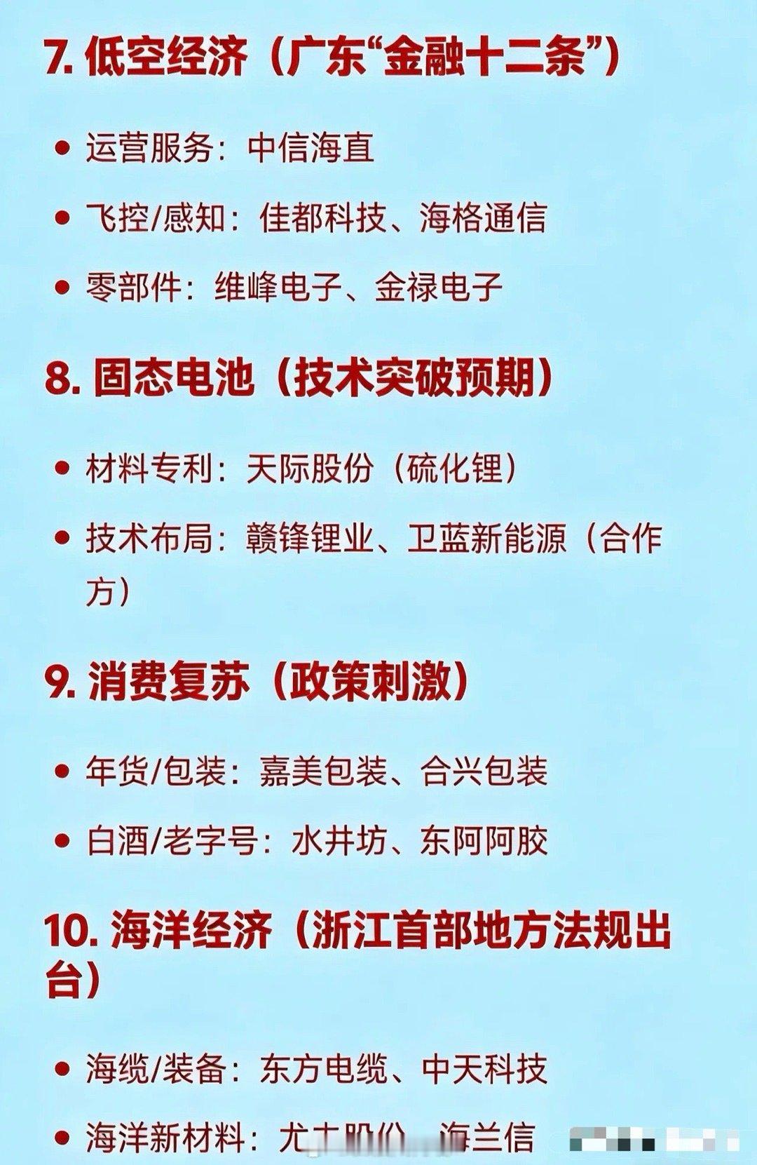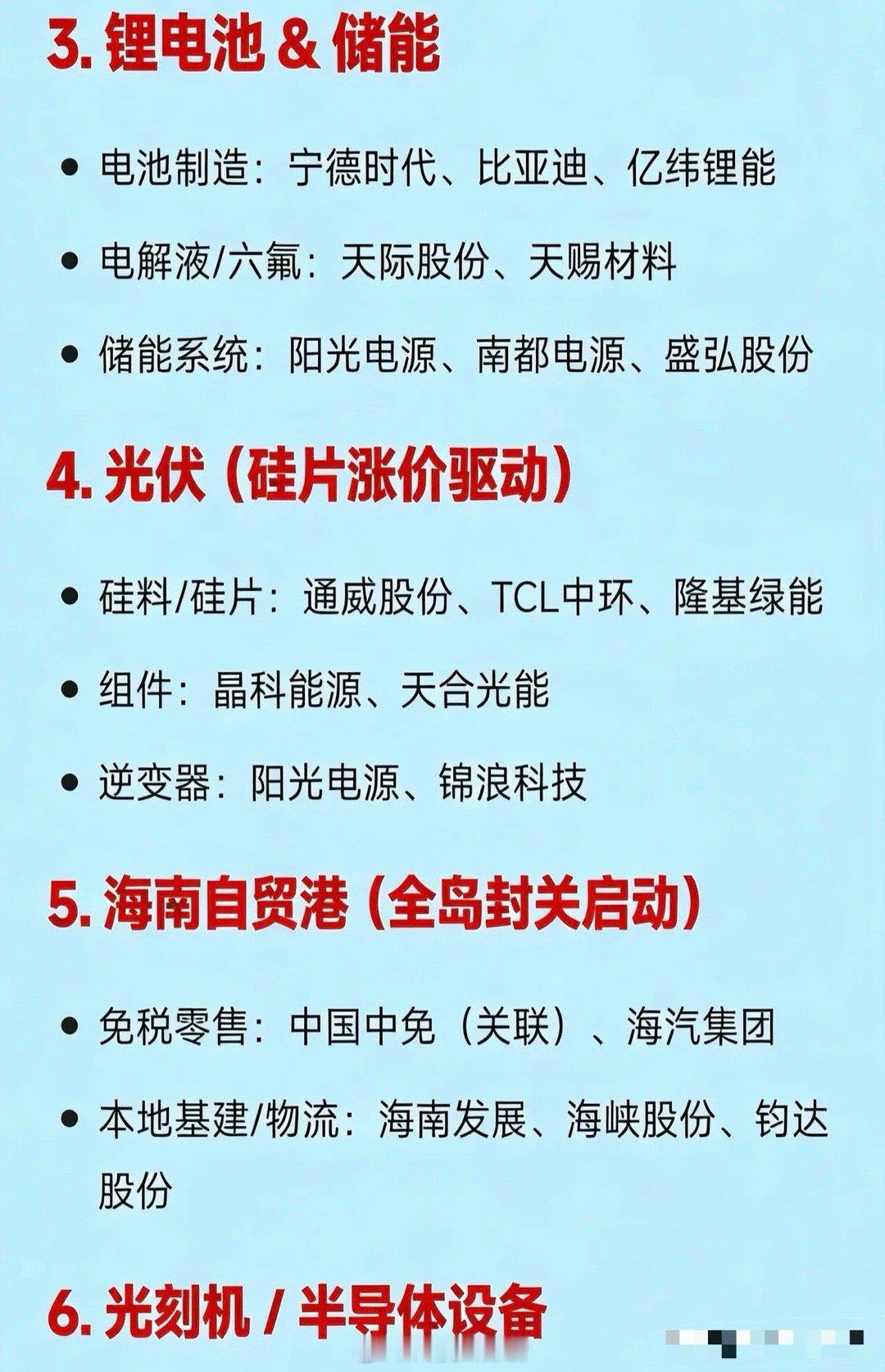 12月26日十大热点概念及产业链龙头梳理1. 商业航天卫星制造:中国卫星火箭/结构件:神剑股份、航天电子、超捷股份航天材料:西部材料、博云新材、再升科技2. 人形机器人整机/平台:优必选(拟入主锋龙股份)减速器:绿的谐波、双环传动伺服/关节:昊志机电、兆威机电控制系统:汇川技术3. 锂电池 & 储能电池制造:宁德时代、比亚迪、亿纬锂能电解液/六氟:天际股份、天赐材料储能系统:阳光电源、南都电源、盛弘股份4. 光伏(硅片涨价驱动)硅料/硅片:通威股份、TCL中环、隆基绿能组件:晶科能源、天合光能逆变器:阳光电源、锦浪科技5. 海南自贸港(全岛封关启动)免税零售:中国中免(关联)、海汽集团本地基建/物流:海南发展、海峡股份、钧达股份6. 光刻机 / 半导体设备光刻整机:上海微电子配套/载体:张江高科、赛微电子、茂莱光学7. 低空经济(广东“金融十二条”)运营服务:中信海直飞控/感知:佳都科技、海格通信零部件:维峰电子、金禄电子8. 固态电池(技术突破预期)材料专利:天际股份(硫化锂)技术布局:赣锋锂业、卫蓝新能源(合作方)9. 消费复苏(政策刺激)年货/包装:嘉美包装、合兴包装白酒/老字号:水井坊、东阿阿胶10. 海洋经济(浙江首部地方法规出台)海缆/装备:东方电缆、中天科技海洋新材料:尤夫股份、海兰信