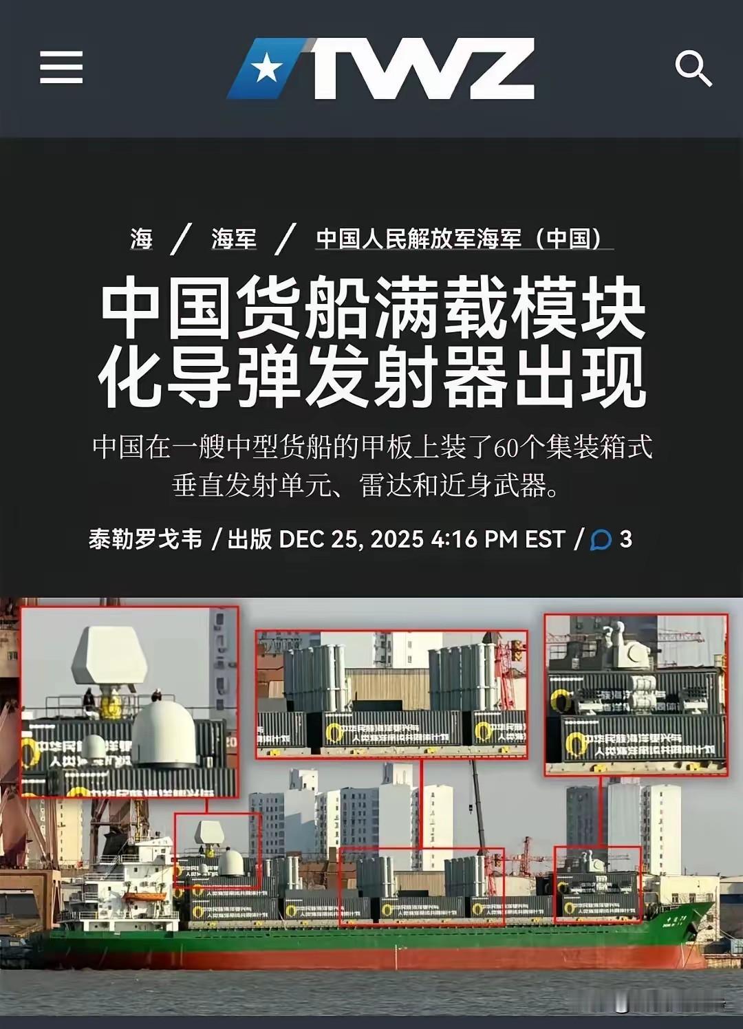 刚过完圣诞节熊猫就出来吓人了! 美媒突然爆料,中国一艘货轮被改造成了导弹发射船。 巨大的货轮上面装了足足60个集装箱式的垂直发射单元。 还有雷达和近身武器。 大家看看,这不就是现成的武库舰吗! 当然了,一定会有人在这里反驳说这种货轮改的没有防御力。 敌人随便派几个无人机就给你炸沉了。 这话说的倒是没错。 但是你想过没有啊,这种货船改的武库舰怎么会单独投入使用呢? 这都是前面有航母,还有大量的055驱逐舰开辟了安全区域之后。 这大宝贝儿才冲上去发射呢。 咱们国家造船行业的产能实在是太过盛了。 这个思路挺好的。 完全就把咱们国家过剩的造船业产能给盘活了。