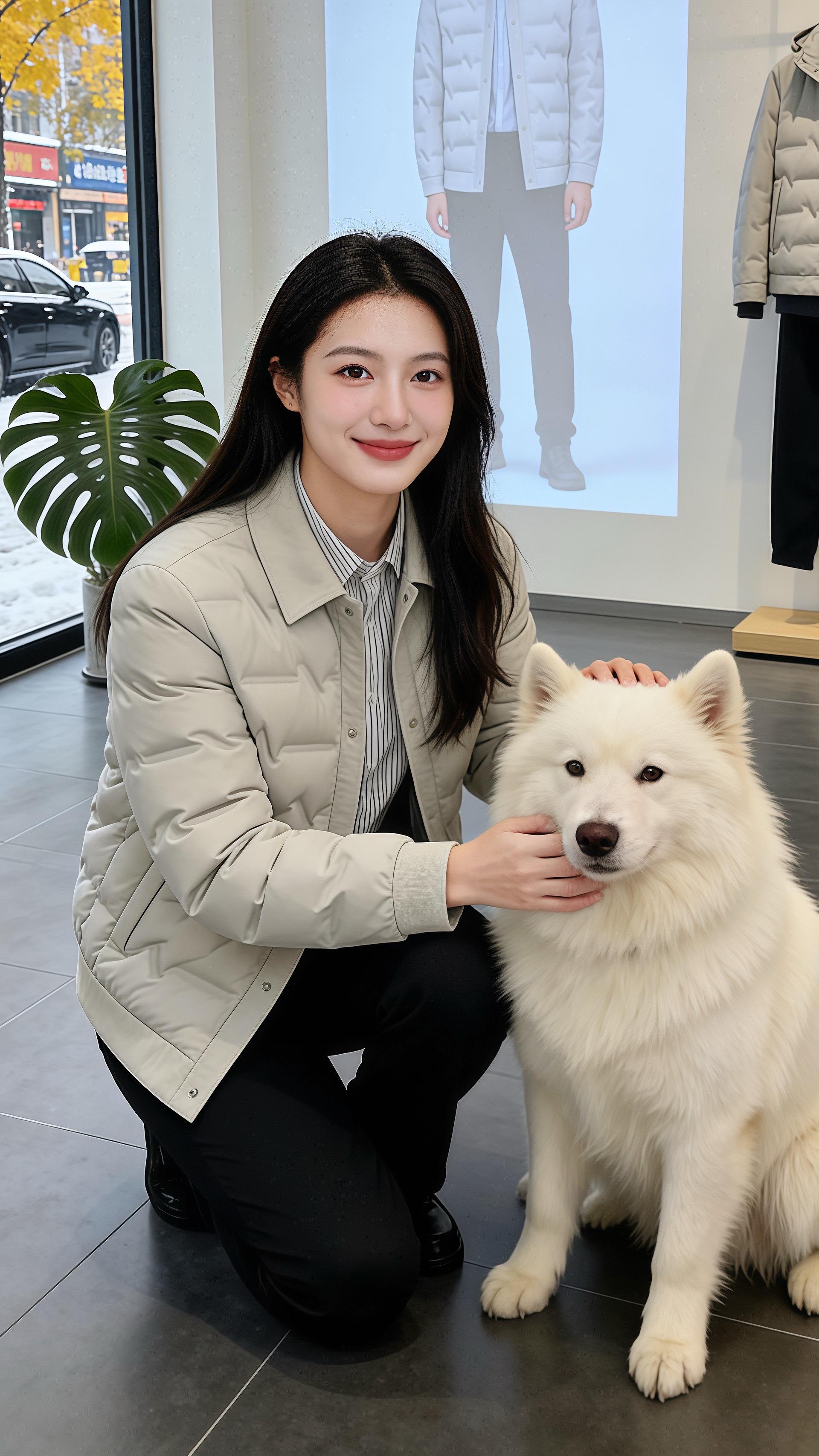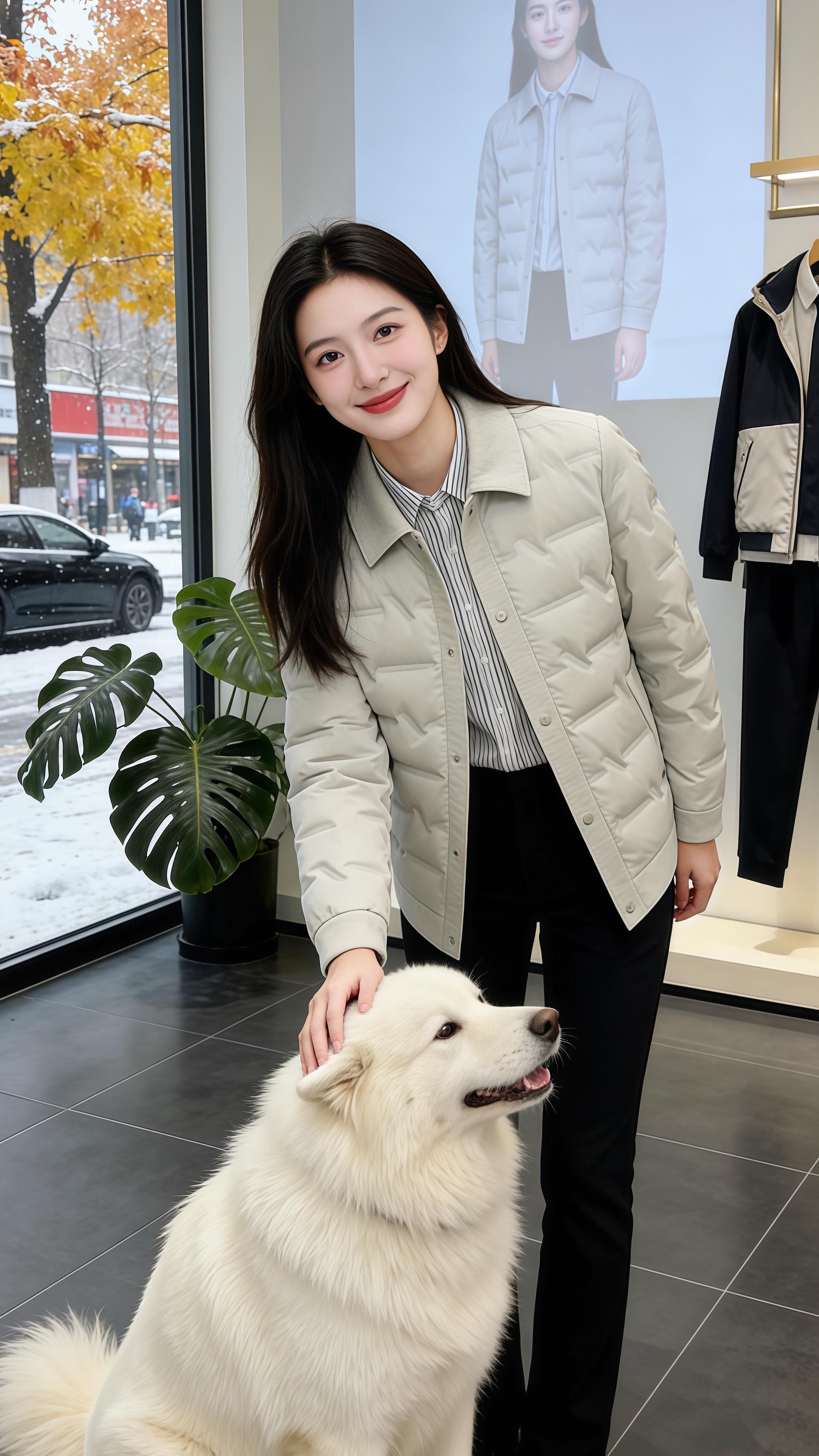 她蹲身揉着萨摩耶的头,外套袖口的罗纹贴在腕骨,夹棉面料蹭过狗毛的样子,比橱窗里的成衣更显鲜活。后来他说,那天她抬手抚狗时,衣摆轻晃的弧度,像把窗外的冬阳都收进了衣褶——不是衣装多考究,是她把简约的杏黑配穿得松弛又有暖意。