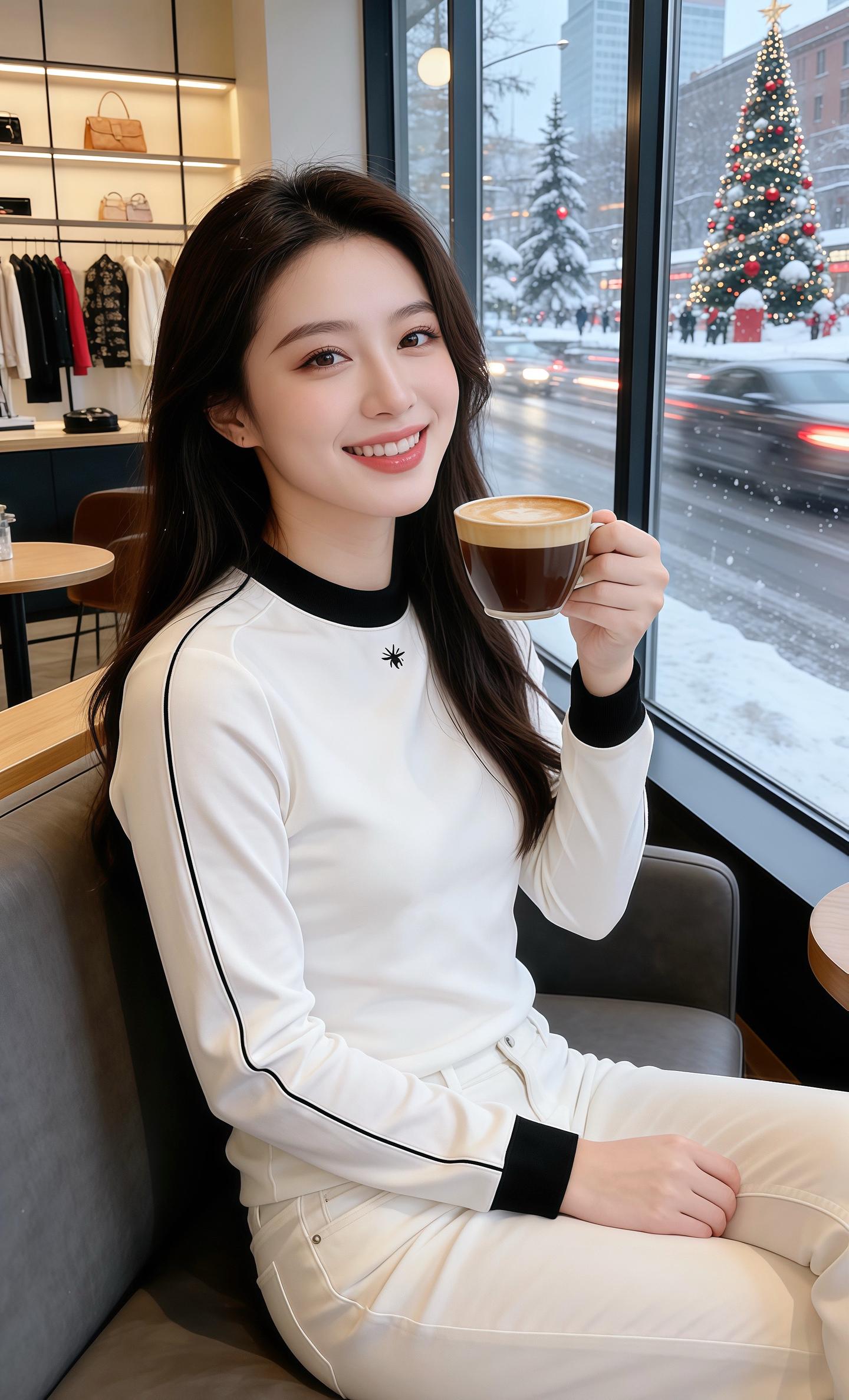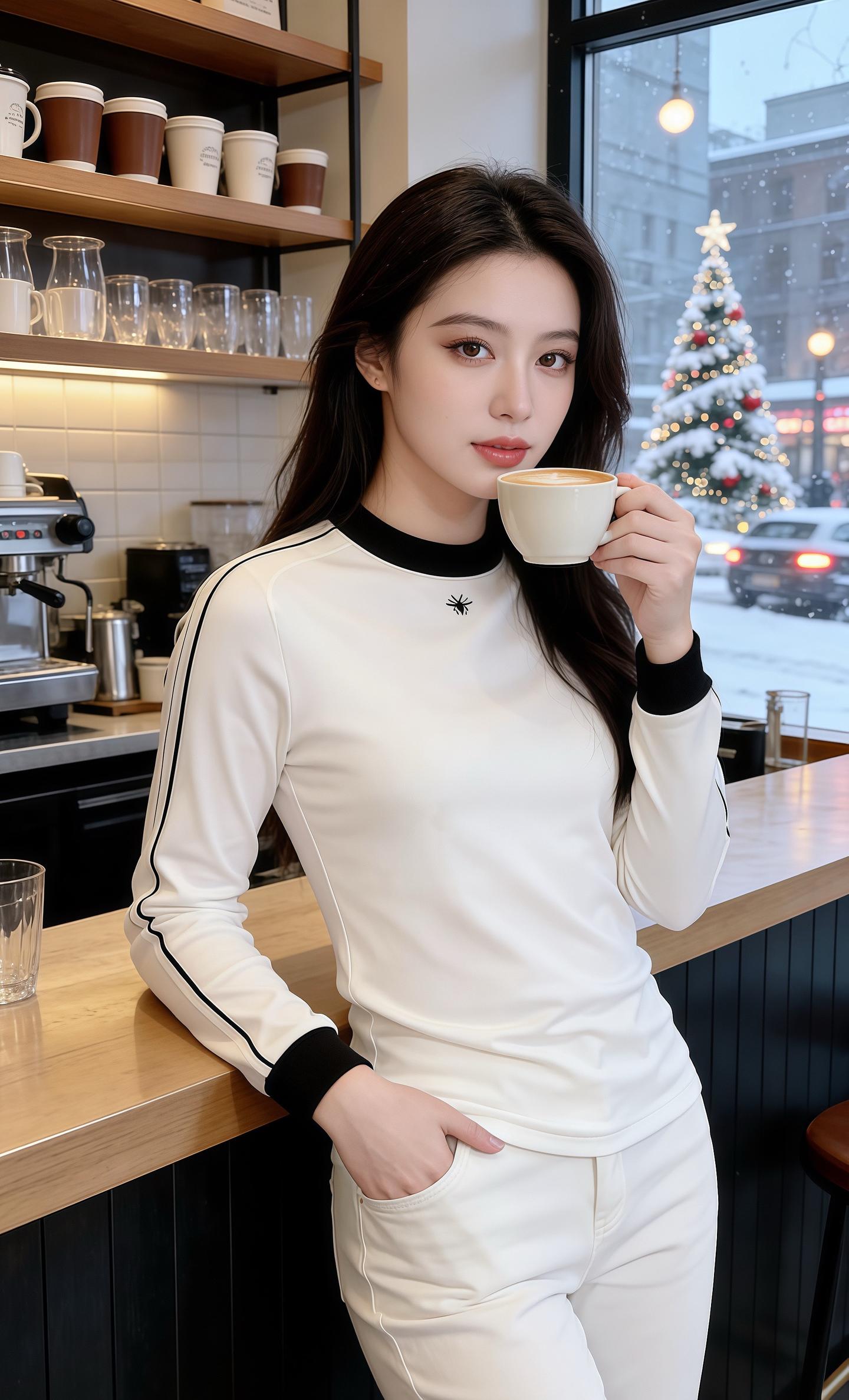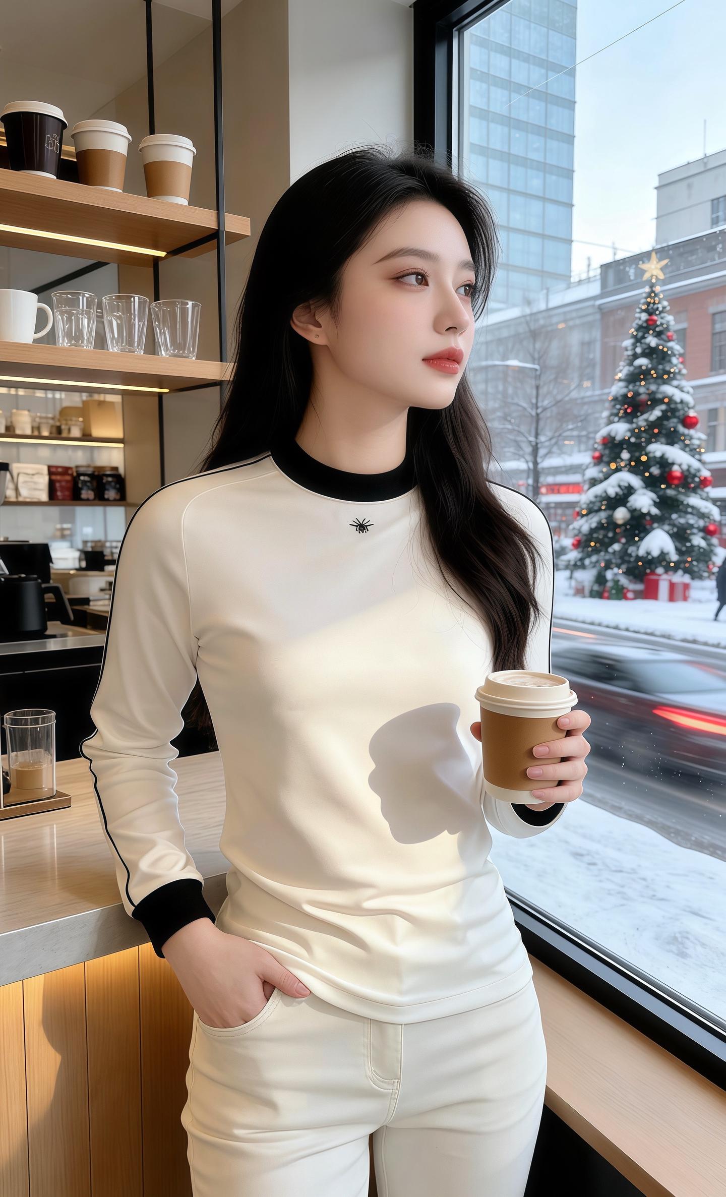 圣诞雪吻着玻璃窗的午后,他走进咖啡馆,一眼撞进她白衫的清透里。白衫的面料带着细腻的柔,领口的黑边像描了一笔精致的墨,侧边的黑纹顺着肩线垂落,配着同色白裤,把冬的冷都揉成了月光般的软。
