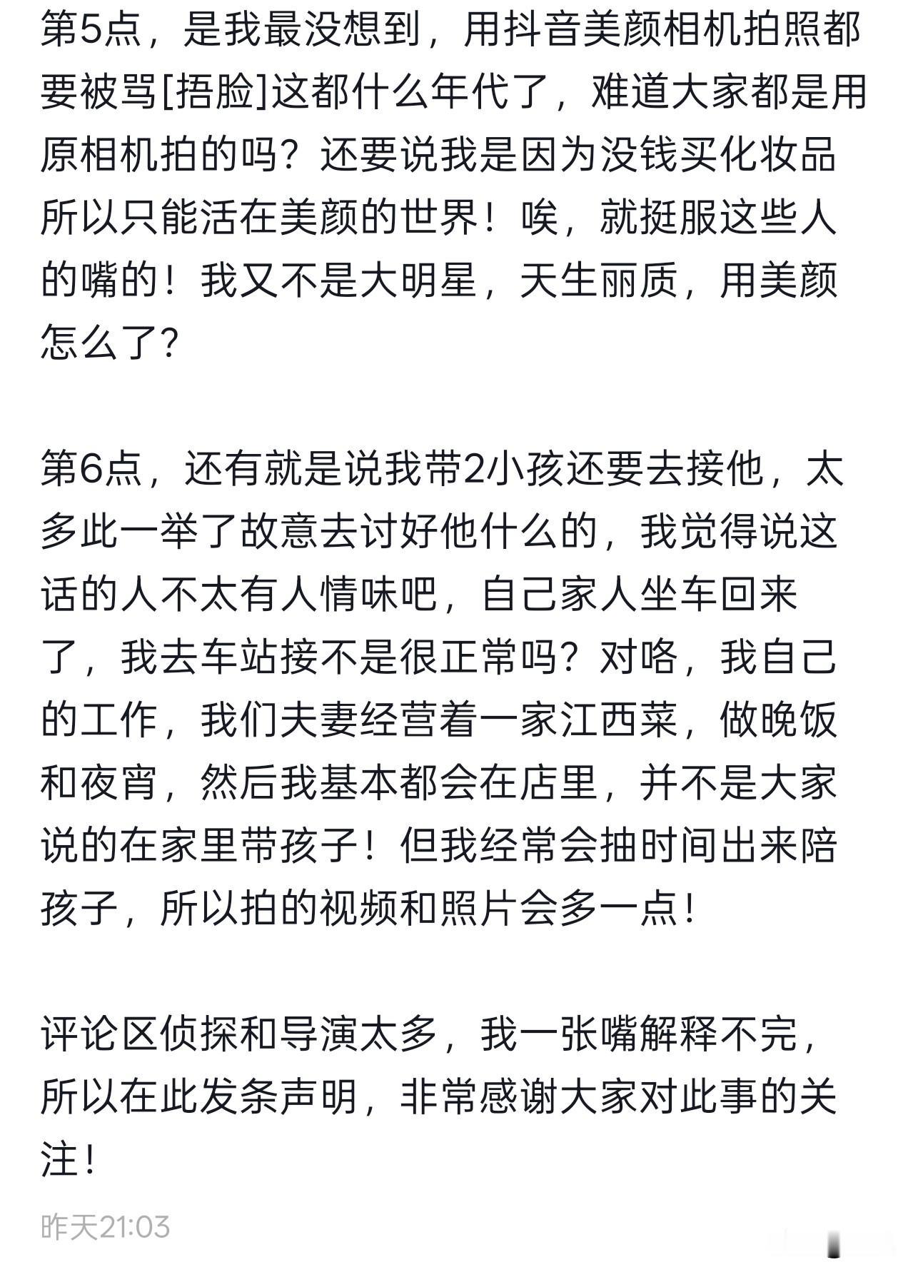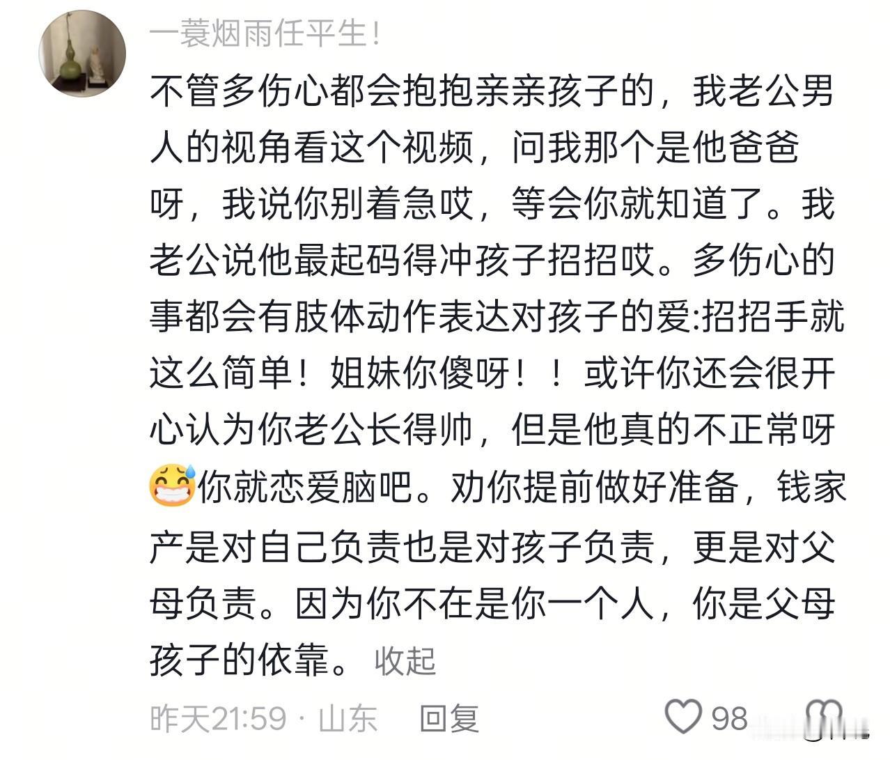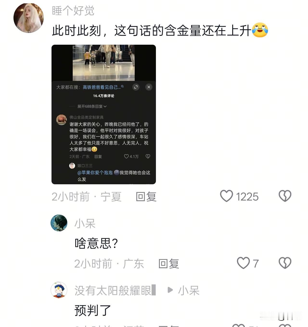高铁站孩子接爸爸后续来了,两夫妻不仅开直播解释,还连续发了两条视频,一条直接问男主有没有出轨,一条6点解释文案。但是,评论区的福尔摩斯又再次上场了,逐一分析,直接判定爸爸出轨了。 更有网友前两天就预判了作者会给出的解释,意思大致不差,是一场误会,评论区的网友成了play的一环。 当然,我也希望是网友多虑了,毕竟孩子还小,希望孩子能健康快乐成长吧!