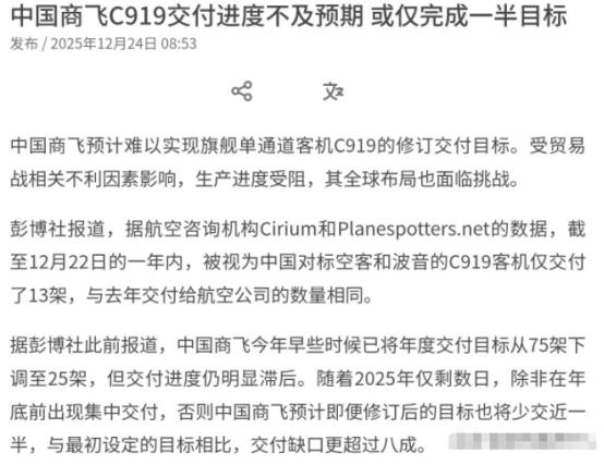 没想到对我们的影响这么大!美国这一出手还是很狠!12月24日,根据外媒报道,外媒称,中国商飞预计难以实现旗舰单通道客机C919的修订交付目标。受贸易战相关不利因素影响,中国商飞生产进度受阻,而其全球布局也面临挑战。外媒表示,中国商飞今年早些时候已将年度交付目标从75架下调至25架,但即便大幅度下调目标,交付进度仍明显滞后。 截至12月22日只交付了13架,这个数据摆在这里,说明问题比预想的要严重得多。 很多人可能会问,为什么我们自己的大飞机还要受制于人。这就涉及到航空制造业的特殊性。大飞机不是简单的组装玩具,它涉及成百万个零部件,需要极其复杂的全球供应链体系。 美国在这个领域积累了几十年的技术优势,他们在发动机、航电系统等关键零部件上占据了垄断地位。 我们在发动机国产化方面虽然一直在努力,但要完全替代成熟的产品,还需要时间和大量的验证飞行。美国正是看到了这一点,才会在关键时刻出手,利用技术优势来限制我们的发展速度。 这种限制带来的直接影响就是生产节奏被打乱。中国商飞本来计划通过规模化生产来降低成本,提升效率,现在却不得不因为零部件供应问题而频繁调整计划。生产线不能满负荷运转,工人们就得等着零件来了再干活。 这种断断续续的生产状态,效率肯定高不了。而且不仅是中国商飞难受,国内的航空公司也在等米下锅。 他们已经下了订单,本来指望新飞机能赶紧投入运营赚钱,结果飞机迟迟交不了,这对他们的运营计划也是一个不小的打击。 更深层次的影响在于我们对未来航空市场的布局。C919不仅仅是用来飞的,它还承载着中国进军国际航空市场的重任。 我们希望通过这款飞机,打破波音和空客的垄断,在世界航空市场上分一杯羹。但如果生产不稳定,交付不及时,信誉度就会受损。 国外的航空公司买飞机,最看重的就是可靠性和交付时间。如果我们连国内的目标都完成不了,国际客户肯定会有顾虑。 这次外媒的报道,虽然话里带着看热闹的意思,但他们指出的产能问题,确实是我们必须面对的现实。 美国政府在这件事上的手段确实狠辣。他们没有直接禁止所有贸易,而是精准打击供应链的关键环节。 这种做法既达到了遏制目的,又没有完全撕破脸。我们要想彻底摆脱这种被动局面,唯一的出路就是加快核心技术的自主研发。 特别是发动机技术,必须尽快实现突破。只有当我们自己能造出高性能、高可靠性的发动机,不再依赖美国产品时,这种被人卡脖子的情况才能真正结束。 现在国内的相关科研机构和企业正在加班加点地攻关。大家都明白,核心技术是买不来的,必须靠自己。虽然这个过程会很艰难,也会有很多挫折,但这是必须要走的路。这次C919遇到的困境,其实也给我们敲响了警钟。 它提醒我们,在高科技领域,任何一点对外部的过度依赖,都可能成为致命的软肋。我们不仅要造出大飞机,还要造出完全拥有自主知识产权的大飞机。 回过头来看这次交付目标的大幅缩水,虽然让人感到遗憾,但也让我们看清了形势。美国这次出手,让我们更加清醒地认识到了掌握核心技术的紧迫性。 这种压力会转化为动力,促使我们加快创新的步伐。虽然短期内C919的生产和交付会受到影响,长远来看,这种经历反而会加速我们国产航空发动机的成熟进程。 未来的路还很长,挑战依然很多,只要我们坚持自主研发,不受制于人,中国的大飞机终究会飞得更高、更远。