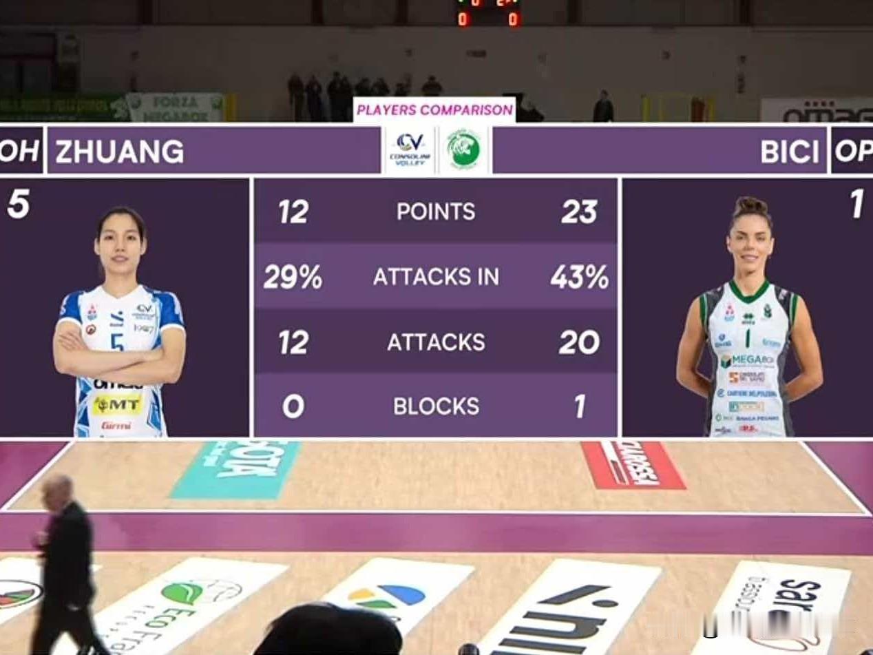 庄宇珊陷入瓶颈!三局仅获12分,无缘个人意甲第二场胜利! 北京时间12月26日23时,庄宇珊迎来个人第四场意甲赛事。意甲第十七轮,圣乔万尼坐镇主场迎战瓦莱福利亚。瓦莱福利亚上轮3-1爆冷击败米兰,目前以9胜7负的战绩位列第六。 第一局,庄宇珊遭遇追发,圣乔万尼开局7-8落后。中局阶段,球队依靠拦防,15-16紧咬比分。后半局进攻依旧乏力,以19-25先输一局。 第二局,庄宇珊进攻状态有所提升,开局6扣4中,助力球队8-7领先。中局13-16落后,最终以20-25再输一局。 庄宇珊单局斩获6分。 第三局,圣乔万尼倒轮次,庄宇珊改打大主攻,开局8-7领先。中局13-16落后,庄宇珊连得3分,16-16追平比分。最终圣乔万尼稍逊一筹,以26-28输掉第三局,0-3负于瓦莱福利亚。 技术统计显示:扣球44-55,拦网9-3,发球2-3,自失17-10。圣乔万尼在进攻和自失控制方面远不及对手。 庄宇珊打满三局,以12分成为全队得分王,41扣12中(4失误2被拦),成功率29%、效率14.6%。接了28个一传,仅有1次失误,到位率71%,完美率41%。 本场比赛,在对手追发和重点拦防的情况下,庄宇珊一传表现出色,但进攻严重受限。在身高不占优的情况下,如何像她的偶像加比一样丰富得分手段,是庄宇珊亟待解决的问题。