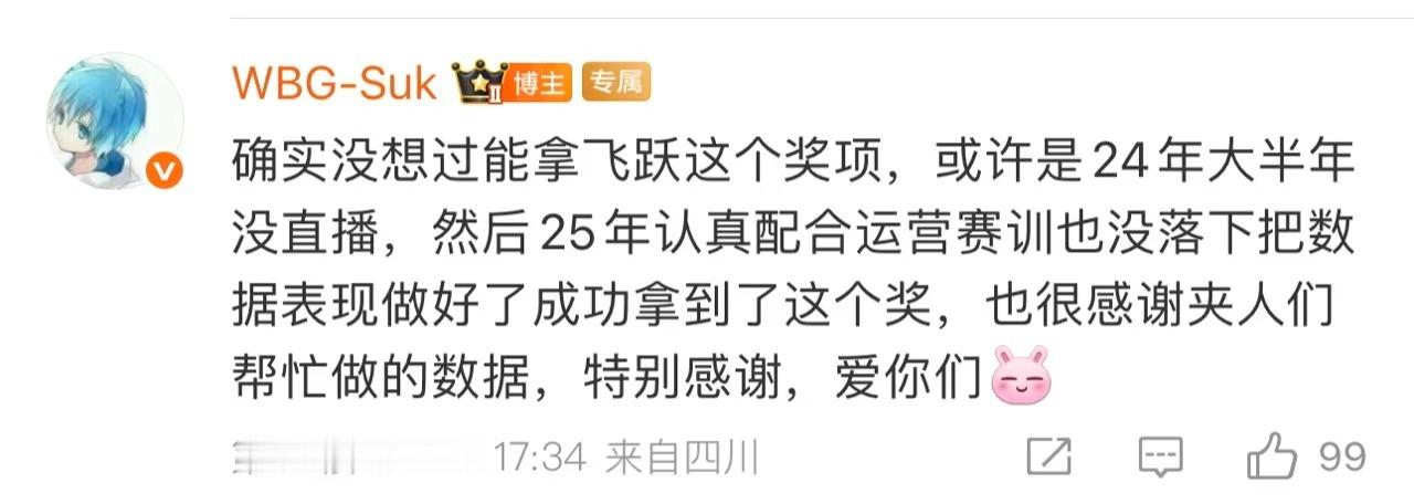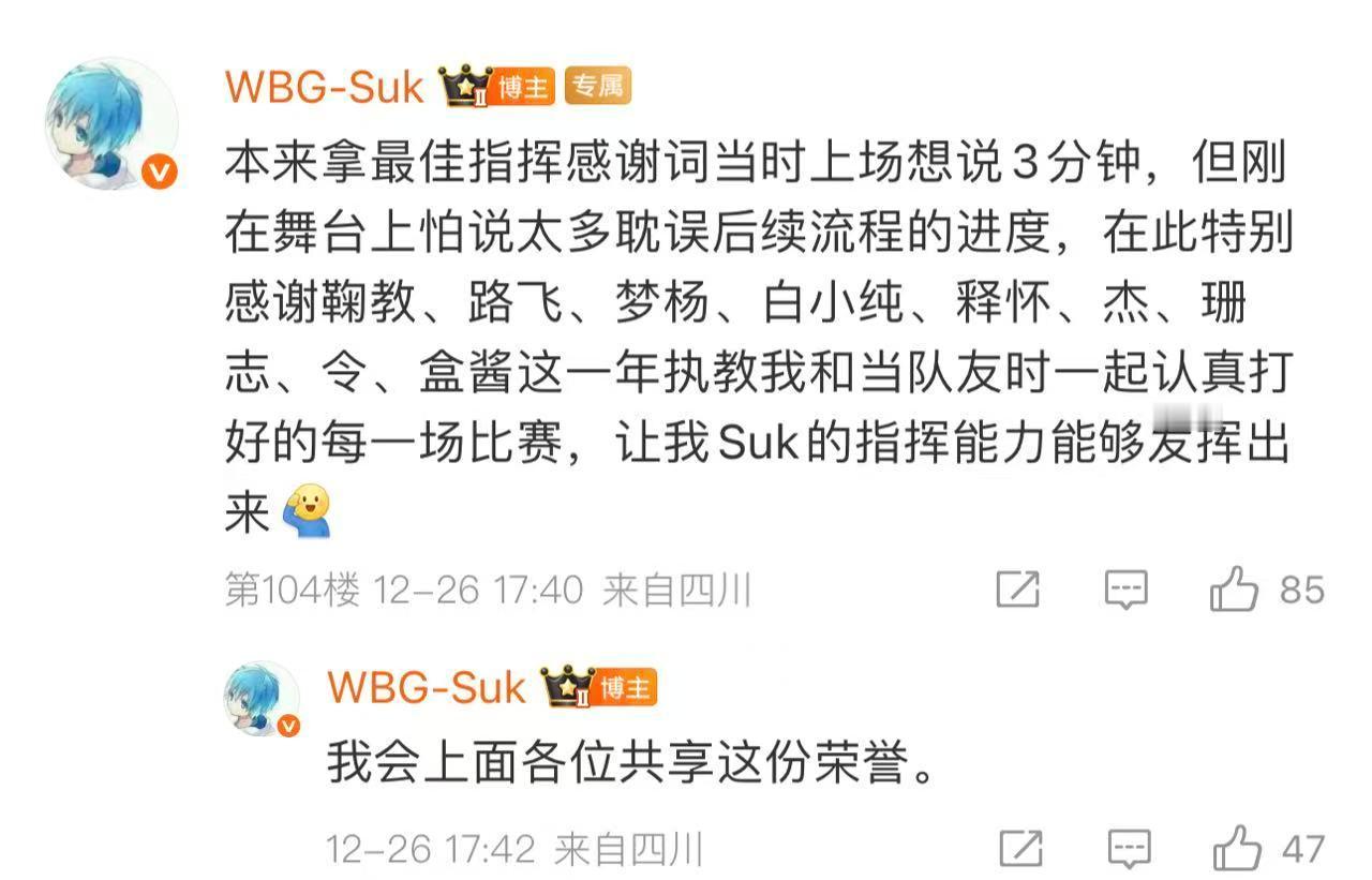 Suk评论区泪目了 双奖傍身的Suk太争气了!从默默无闻到光芒万丈,他的每一步都走得很稳,这份荣誉是对他最好的肯定,WBG继续向前冲!