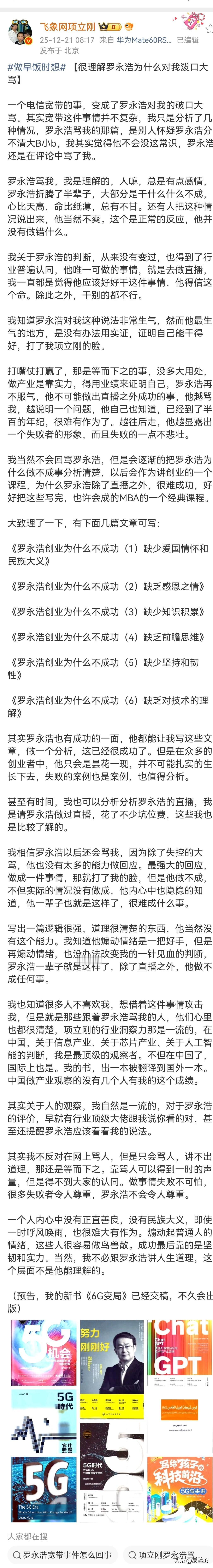 项立刚知道骂不过罗永浩,不打算对骂,所以说:罗永浩骂我,我是理解的,人嘛,总是有点感情,罗永浩折腾了半辈子,大部分是干什么什么不成,心比天高,命比纸薄,总有不甘。还有人把这种情况说出来,他当然不爽。这个是正常的反应,他并没有做错什么。 然后说,要写本几篇文章,围绕罗永浩为什么创业不成功来写。包括《罗永浩创业为什么不成功(1)缺少爱国情怀和民族大义》 《罗永浩创业为什么不成功(2)缺乏感恩之情》 《罗永浩创业为什么不成功(3)缺少知识积累》 《罗永浩创业为什么不成功(4)缺乏前瞻思维》 《罗永浩创业为什么不成功(5)缺少坚持和韧性》 《罗永浩创业为什么不成功(6)缺乏对技术的理解》 我感觉这样要是写出来,罗永浩该怎么回?除了再说一次xxx是xx之外,还真没什么办法。 但罗永浩毕竟是罗永浩,不可能认输,至少要打个平手才能罢休。 他会怎么出招,拭目以待吧