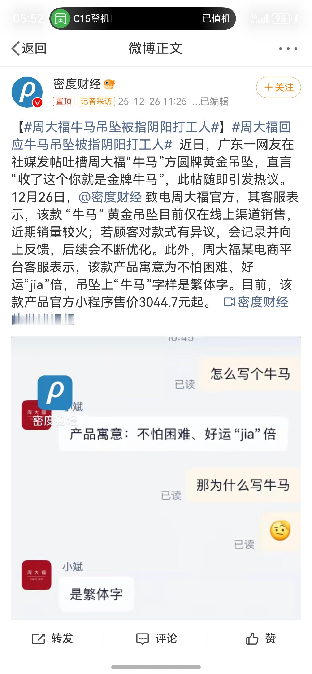 周大福牛马吊坠被指阴阳打工人 我觉得挺有创意的,这种屎盆子真没必要乱扣吧 话又说
