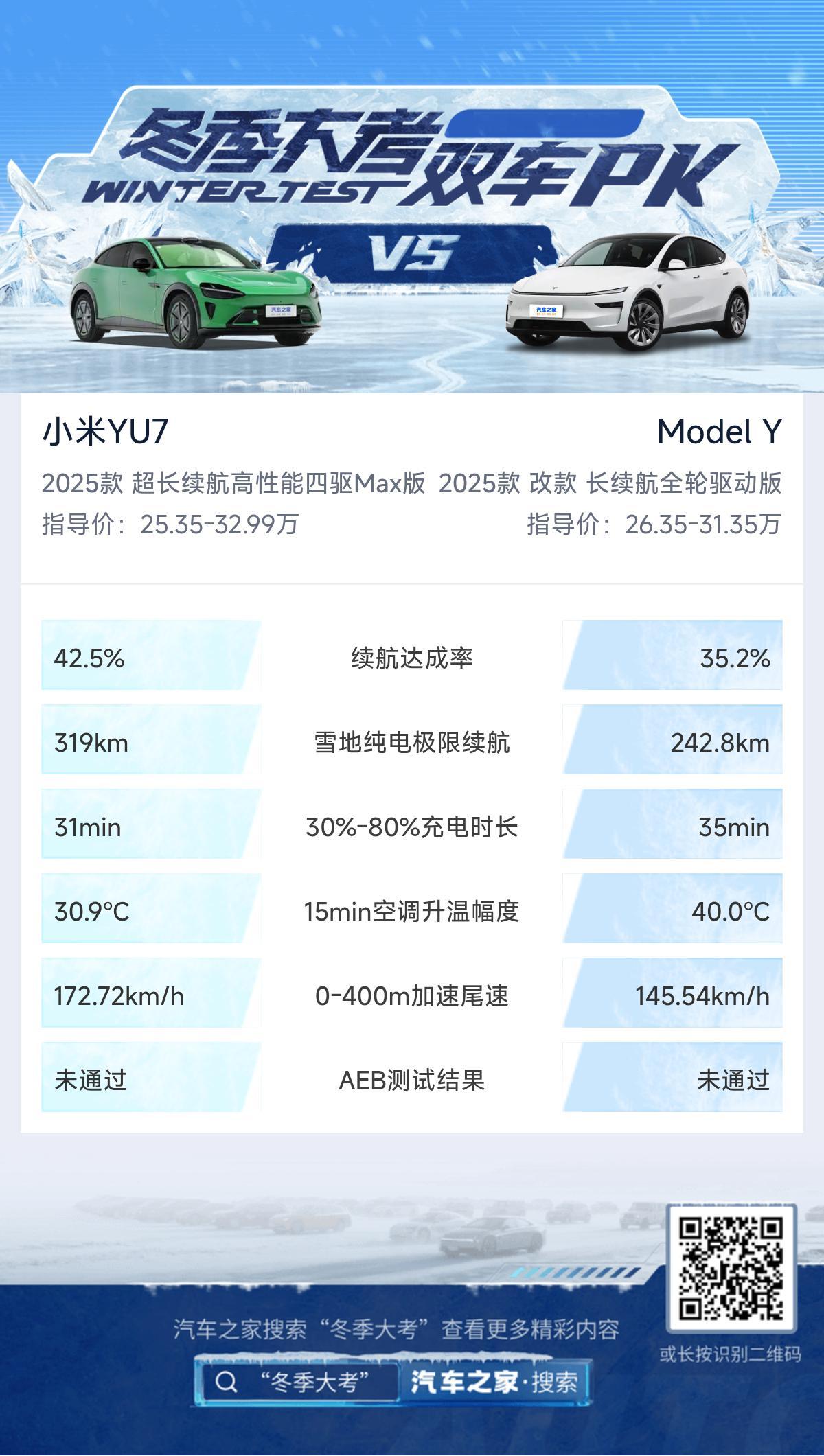 雷军回应小米YU7冬测成绩小米YU7冬季实测五项第一汽车之家冬测结果出了,小米YU7表现确实猛。零下20度极寒环境下,实测续航319公里,比特斯拉Model Y领先近80公里,组内续航和达成率都拿第一。平均充电功率102.5kW,充电效率组内第一、全场第二,同级特斯拉80度电池充满要2个多小时。加速成绩更是全场冠军,超越了所有轿车。这不只是数据好看,更是小米三电技术的硬核体现。行业唯一的双模热泵高效回收热量,整车能量流模型系统优化,把长续航做成了产品基因。去年SU7冬测领先,今年YU7再夺第一,实力回应了所有质疑。之前那些阴阳准冬测的声音,现在权威实测成绩摆在面前,真可以歇了