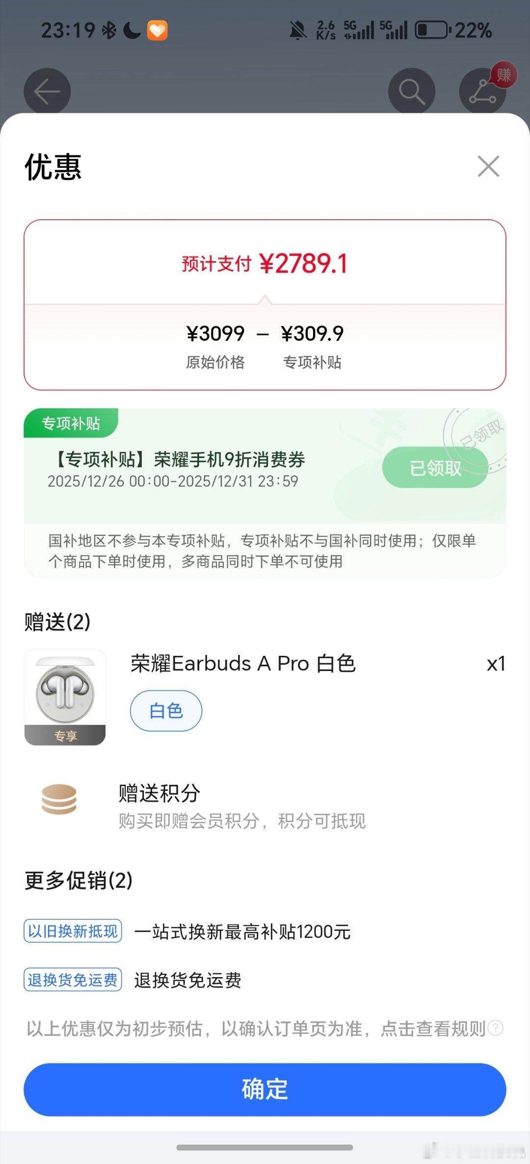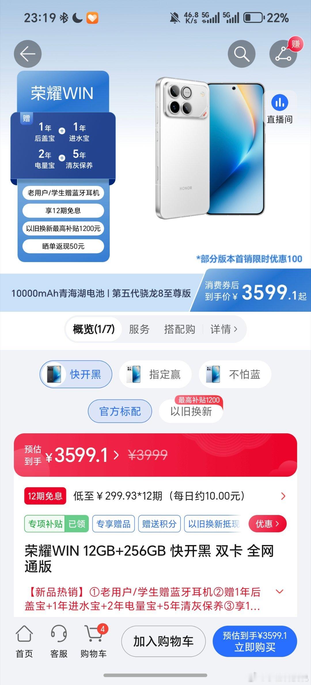 荣耀WIN系列现在在荣耀商城下单,有一个荣耀手机的9折消费券,荣耀WIN RT到手价仅需2339.1元起,荣耀WIN到手价仅需3599.1元起。还有荣耀Earbuds A Pro耳机赠送,以及1年后盖保+1年进水保+2年电量保+5年清灰保养,还是非常划算的。荣耀WIN