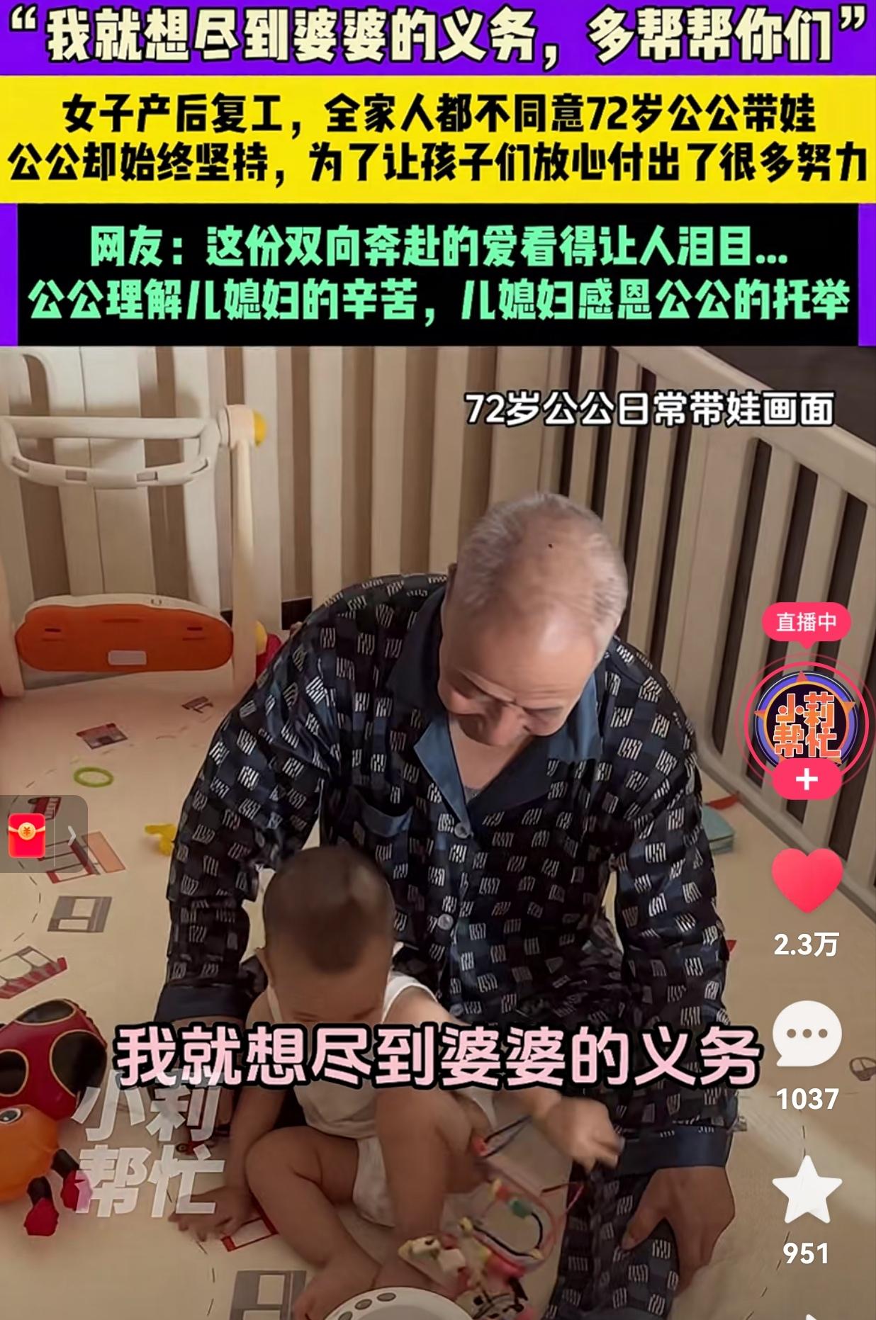 看哭了!女子产后复工,全家人都不同意,72岁公公硬扛带娃的重担,公公说:没婆婆,我就替她把这份责任担起来。网友:太暖了太暖了!这才是家人该有的样子,没有婆婆又咋样,公公把这份爱全补上了! 陕西,一女子生完孩子后,身体也恢复好了,想回去上班,愁得直挠头。 家里人全都拦着,不想让女子出去上班,不想让72岁的公公帮忙带娃,因为老爷子年纪大了,害怕老爷子身体扛不住这份累。可老爷子倔得跟头老牛似的,铁了心要揽下这档子事儿。 “我娃没了妈,我就得把娃妈的担子挑起来!”“你现在没婆婆,我就替她尽这份义务,多帮衬帮衬你们!”老人红着眼眶说的这两句话,听着糙,却字字戳心窝子。 他哪是单纯想帮儿子儿媳省个育儿嫂的钱啊?分明是把失去老伴的那份遗憾,一股脑儿化成了对儿媳的疼惜、对孙辈的疼爱。 72岁,已过古稀之年,本该是坐在院子里晒晒太阳、跟老伙计们唠唠嗑的年纪,硬是天天围着小奶娃的吃喝拉撒打转。花白的头发,蹒跚的脚步,愣是撑起了小两口安心上班的底气。 儿媳一提起公公,眼眶唰地就红了,儿媳妇说:“爸能主动说帮我们看娃,我这心里,暖得都快化了!”这份情分,哪儿是钱能衡量的? 网友看到后评论说:“这老爷子也太好哭了!啥叫亲情啊,这就是!换我有这公公,指定把他伺候得舒舒服服的!” 还有的网友说:“看完破防了,好公公都是别人家的?不,是懂得珍惜的家庭,才能养出这么有担当的老人! 老话说得好,家和万事兴,又说人心换人心,八两换半斤。这家人的事儿,就是最好的例子。 公公体谅儿媳妇产后复工的难处,甘愿拿晚年的清闲,换晚辈的安稳。 儿媳记着公公的付出,把这份恩情装在心里、落实在行动上。 亲情这东西,从来都不是单方面的付出。而是你愿意为我遮风挡雨,我就愿意为你暖心暖胃,这种双向奔赴的爱,才让一个小家有了最暖的模样。 其实啊,日子里的幸福根本不在啥惊天动地的大事里,就藏在这些鸡毛蒜皮的付出和感恩里。 就像这位72岁的老爷子,用最实在的行动告诉我们:家人之间的牵绊,从来都是你疼我一分,我敬你一丈。 也让我们明白,真正的亲情,从来不是血缘绑出来的,而是心甘情愿的付出和彼此珍惜。 针对此事,大家有什么看法呢?