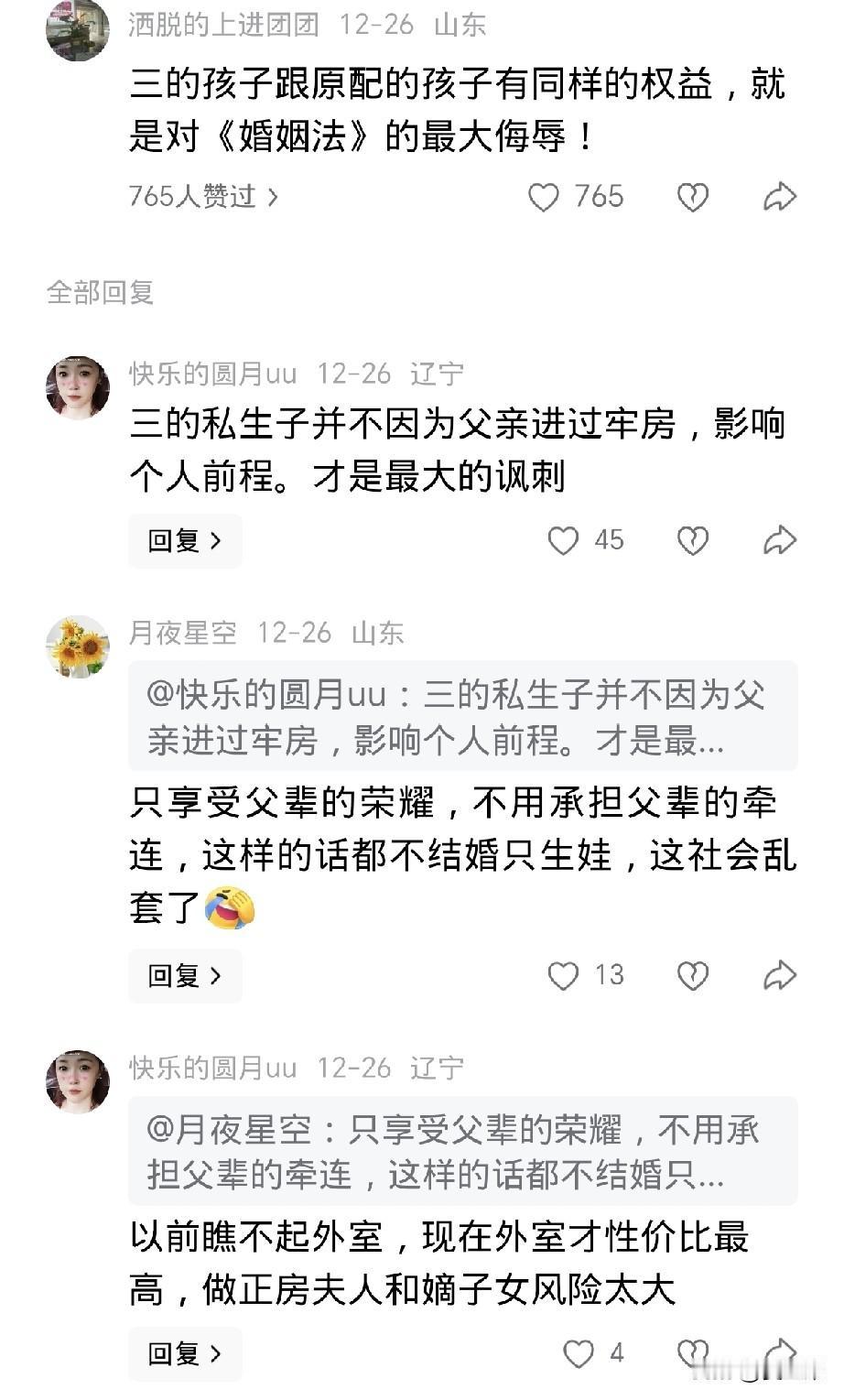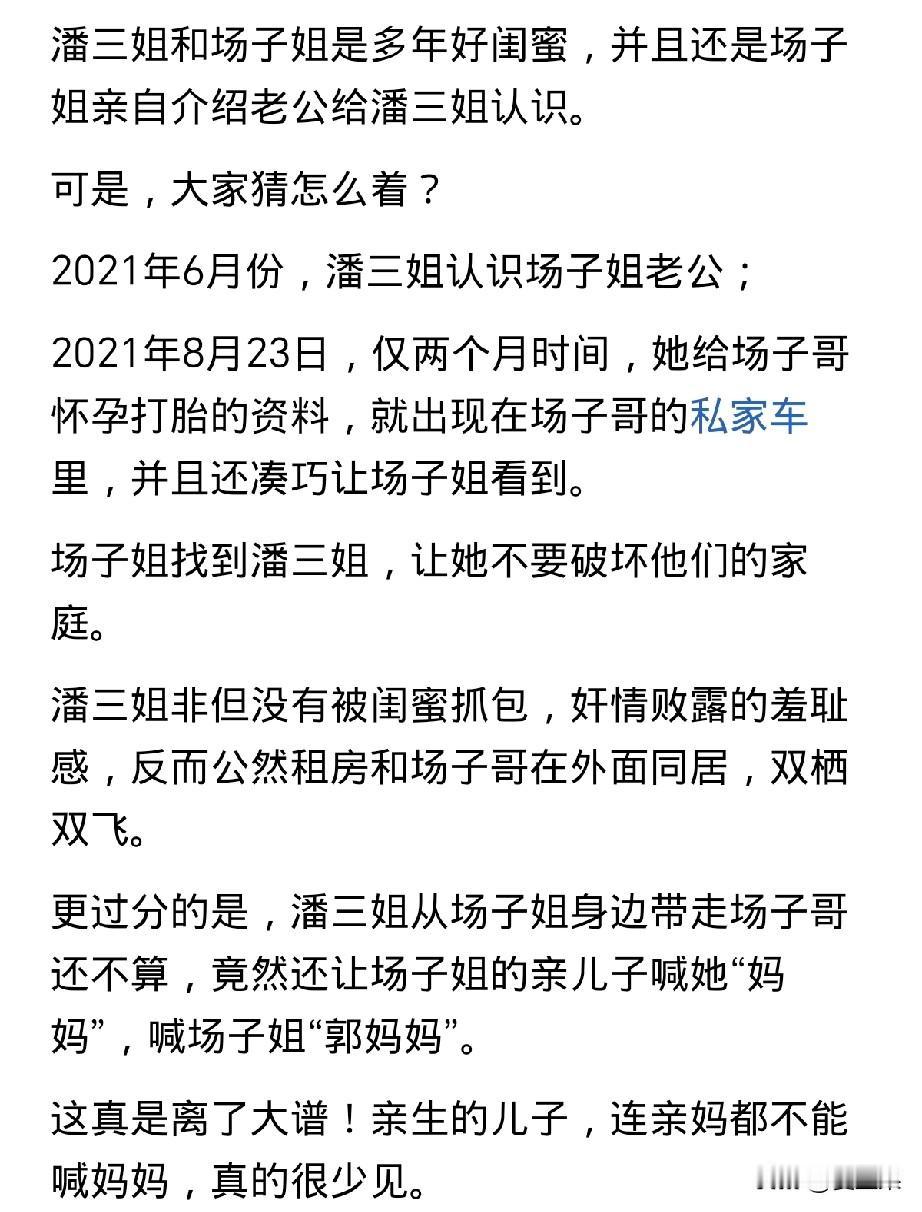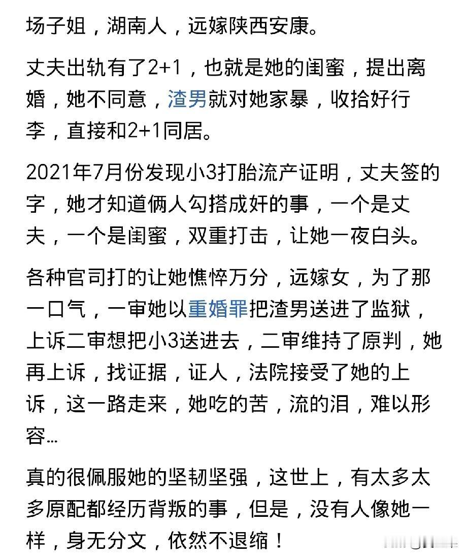 必须支持场子姐, 她是在用一己之力,捍卫所有原配的尊严, 是在用一己之力,发出堵住对婚姻法漏洞的呼吁。 凭什么三有破坏他人的婚姻事实,却不能受罚? 一个与丈夫白手起家到成立有五家公司帮助丈夫成为成功人士的女人,却被闺蜜白手摘桃,被丈夫和闺蜜联手背刺,你怎么忍? 一方面,原配情感、婚姻的双重背叛,给场子姐带来重大打击;一方面,三耀武扬威,摆着胜利者的姿态说自己是一个讲良心的人。你怎么忍? 有人说场子姐输了,还说儿子肯定会记恨她,因为她把丈夫送进牢房会导致孩子将来不能考公。 如果孩子有这种想法,就说明孩子的三观也被他爸爸和三道德扭曲的行为给影响了,而罪魁祸首不是他妈妈,而是他的爸爸和三。 如果孩子都不支持,说明场子姐更需要支持,如果场子姐能够一己之力,改变婚姻法,扭转这种道德沦丧的局面,那她真的是一位英雄。
