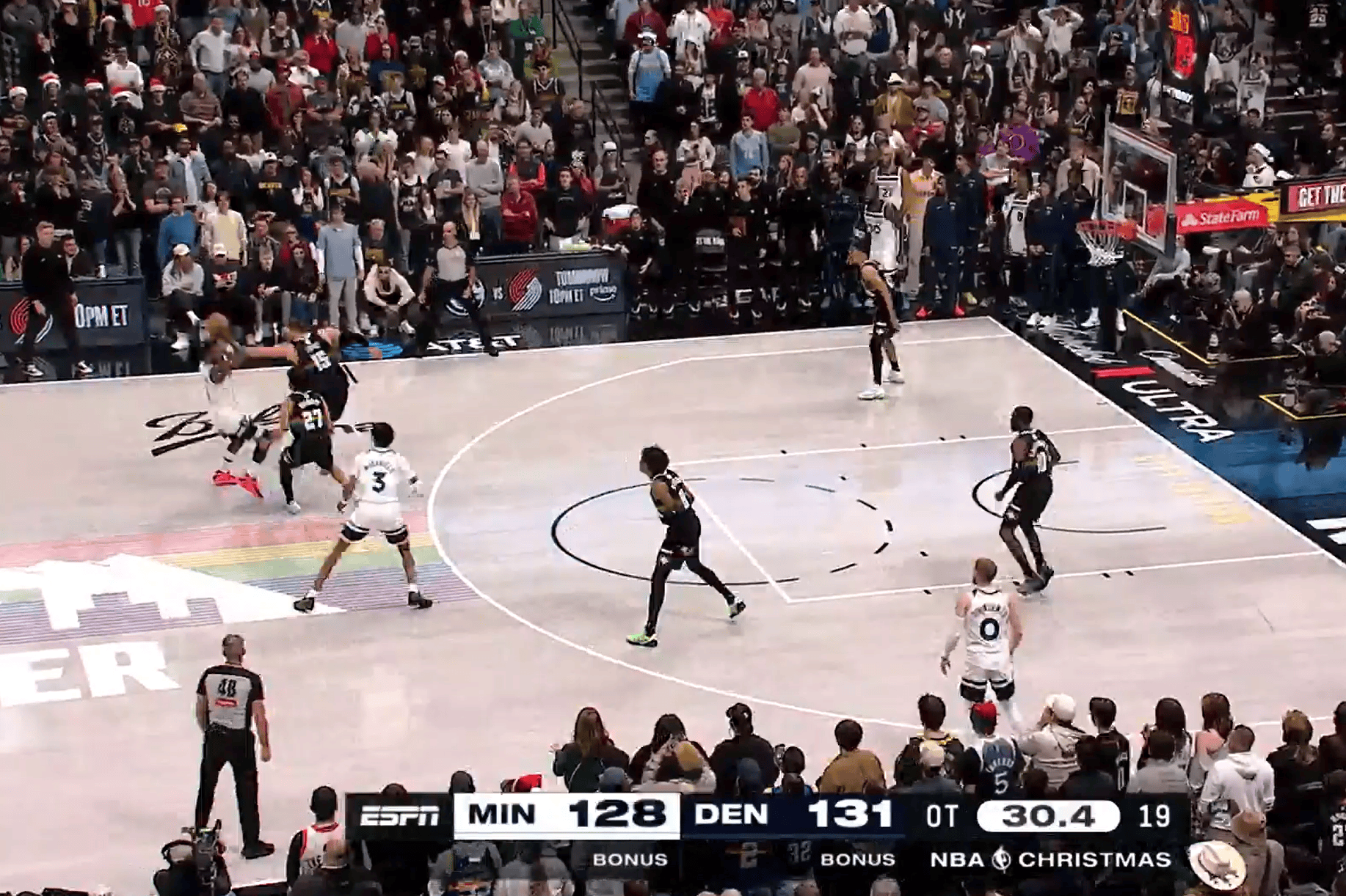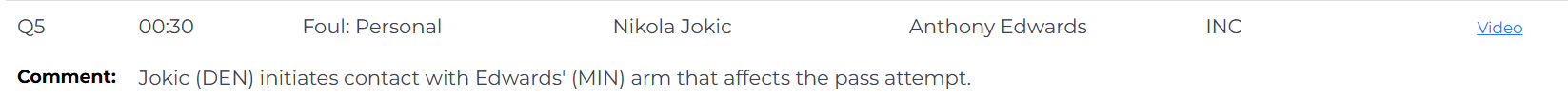 加时赛最后30秒时,裁判漏吹了约基奇与爱德华兹的手臂发生接触并影响了后者的传球。
