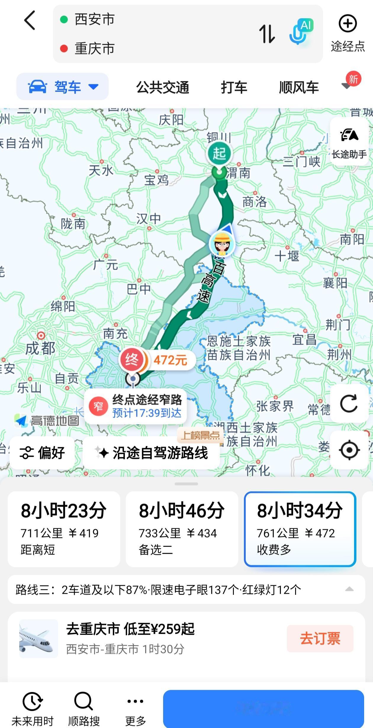 导航显示西安到重庆有三条高速路线你选择走哪?用时都在8个半小时左右,第一条全程经过包茂高速,711公里,收费419元;第二条经京昆高速走安康转包茂高速,全程733公里,收费434元;第三条经包茂高速走安康转银百高速,全程761公里,收费472元。