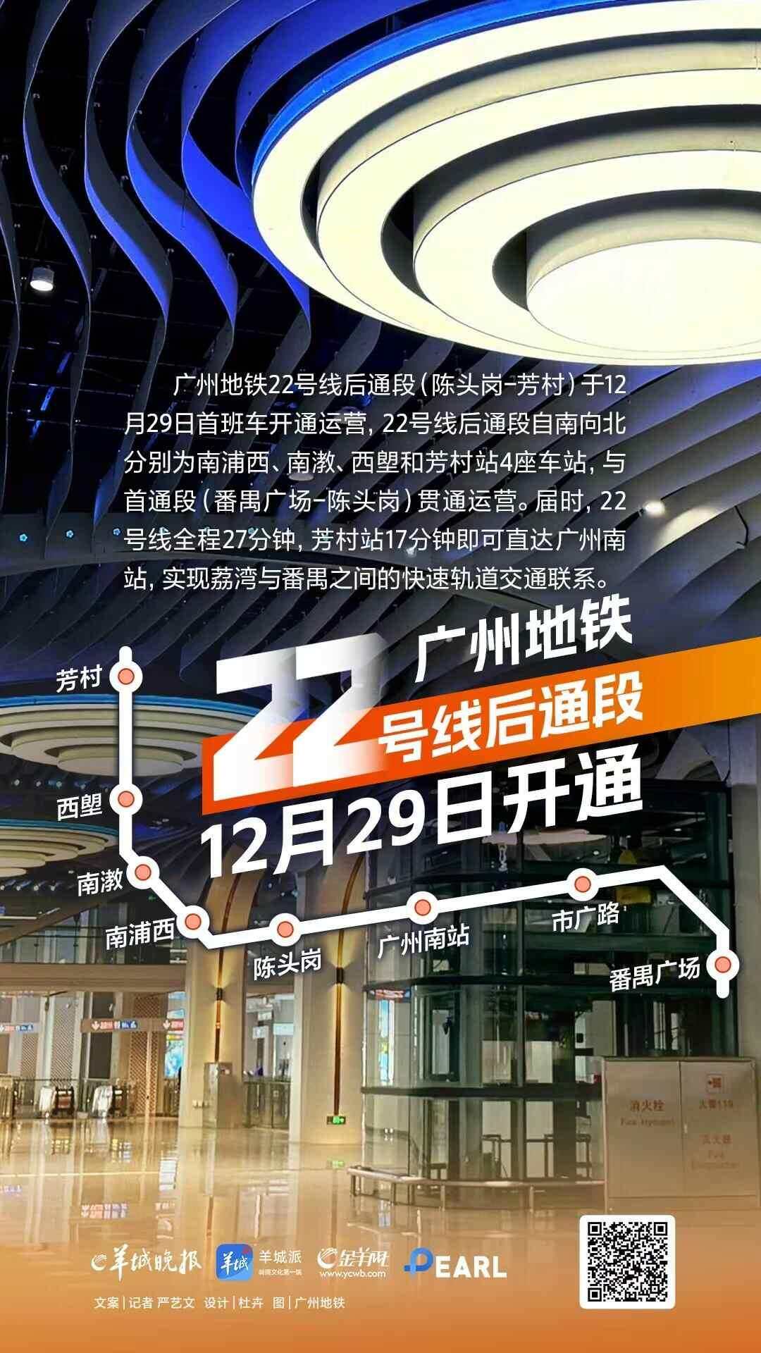 在市委市政府和广大市民的支持下,广州地铁二十二号线后通段(陈头岗-芳村)已完成各项筹备工作,定于12月29日首班车起正式投入运营。至此,广州地铁线网运营总里程达到779.9公里,车站将增加至397座。